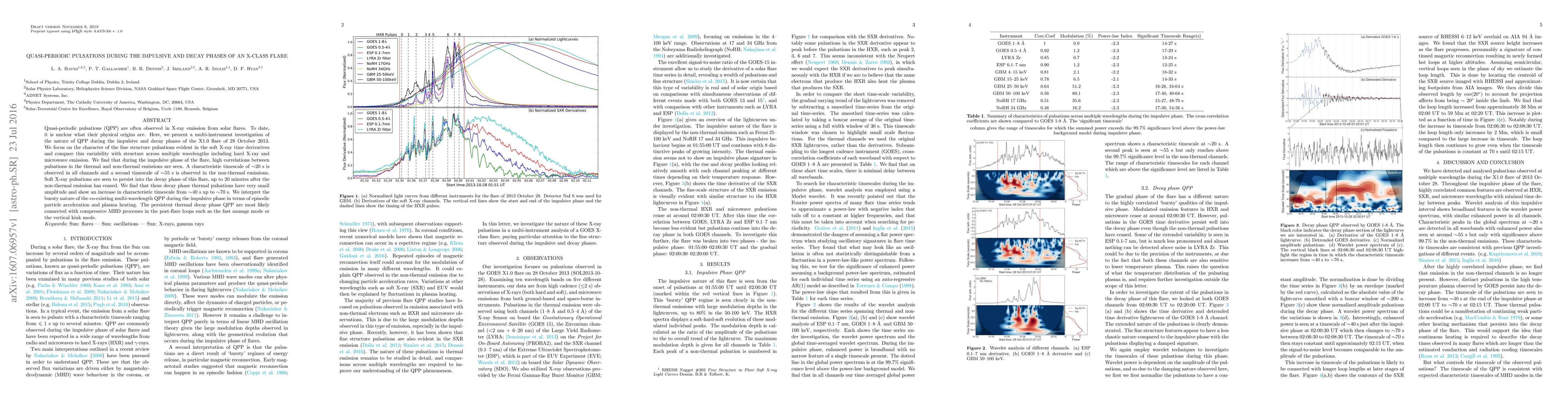 Quasi-periodic pulsations (QPP) are often observed in X-ray emission from solar flares. To date, it is unclear what their physical origins are. Here, we present a multi-instrument investigation of the nature of QPP during the impulsive and decay phases of the X1.0 flare of 28 October 2013. We focus on the character of the fine structure pulsations evident in the soft X-ray time derivatives and compare this variability with structure across multiple wavelengths including hard X-ray and microwave emission. We find that during the impulsive phase of the flare, high correlations between pulsations in the thermal and non-thermal emissions are seen. A characteristic timescale of ~20s is observed in all channels and a second timescale of ~55s is observed in the non-thermal emissions. Soft X-ray pulsations are seen to persist into the decay phase of this flare, up to 20 minutes after the non-thermal emission has ceased. We find that these decay phase thermal pulsations have very small amplitude and show an increase in characteristic timescale from ~40s up to ~70s. We interpret the bursty nature of the co-existing multi-wavelength QPP during the impulsive phase in terms of episodic particle acceleration and plasma heating. The persistent thermal decay phase QPP are most likely connected with compressive MHD processes in the post-flare loops such as the fast sausage mode or the vertical kink mode.