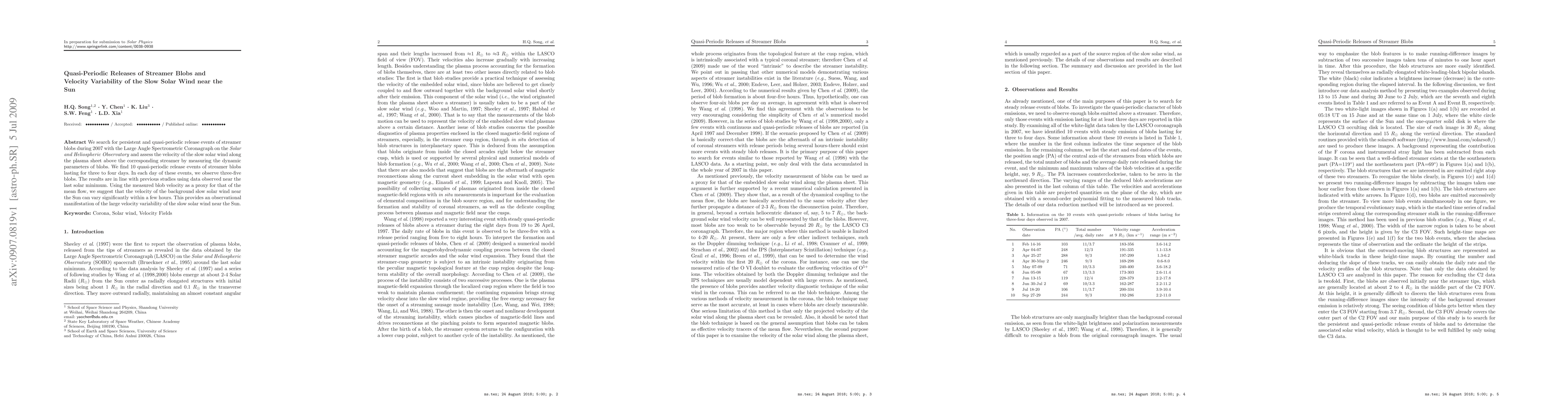 This study identifies quasi-periodic release events of streamer blobs using data from the Large Angle Spectrometric Coronagraph on the Solar and Heliospheric Observatory. It finds significant variability in the velocity of the slow solar wind near the Sun, suggesting large fluctuations within a few hours.