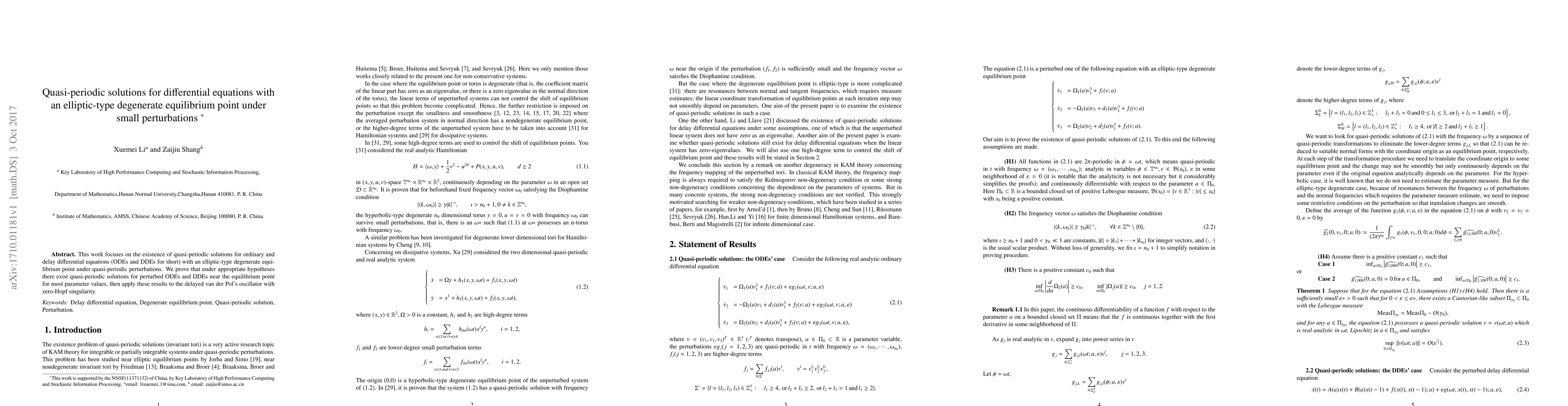 This paper investigates the existence of quasi-periodic solutions for perturbed ODEs and DDEs with an elliptic-type degenerate equilibrium point, proving their presence under specific conditions, and applies these findings to the delayed van der Pol's oscillator with zero-Hopf singularity.