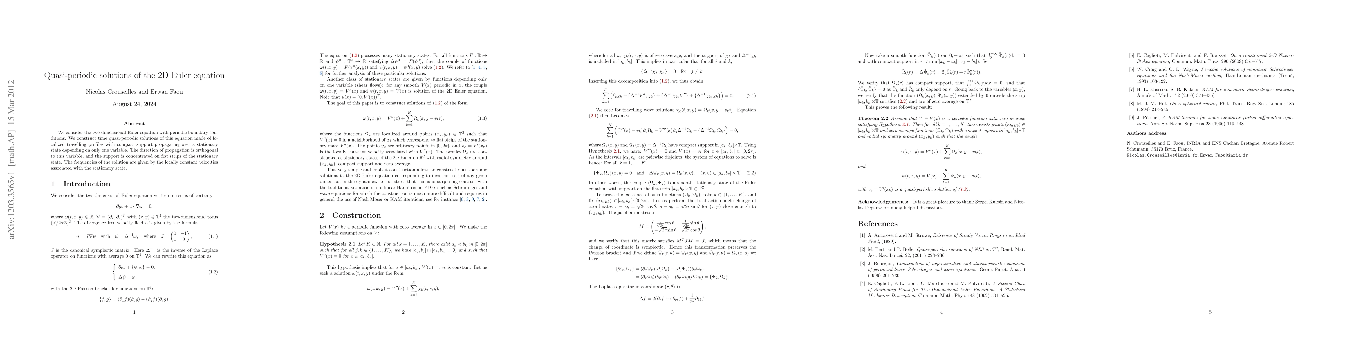 We consider the two-dimensional Euler equation with periodic boundary conditions. We construct time quasi-periodic solutions of this equation made of localized travelling profiles with compact support propagating over a stationary state depending on only one variable. The direction of propagation is orthogonal to this variable, and the support is concentrated on flat strips of the stationary state. The frequencies of the solution are given by the locally constant velocities associated with the stationary state.
