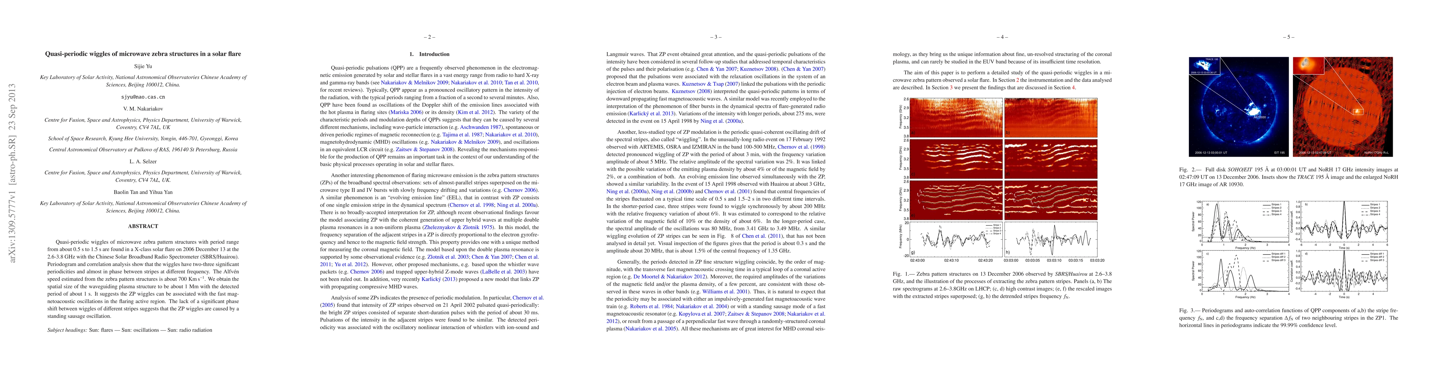 This study identifies quasi-periodic wiggles in microwave zebra pattern structures during a solar flare, revealing significant periodicities and suggesting they are linked to fast magnetoacoustic oscillations. The findings indicate a standing sausage oscillation with an Alfven speed of approximately 700 km/s and a plasma structure size of about 1 Mm.