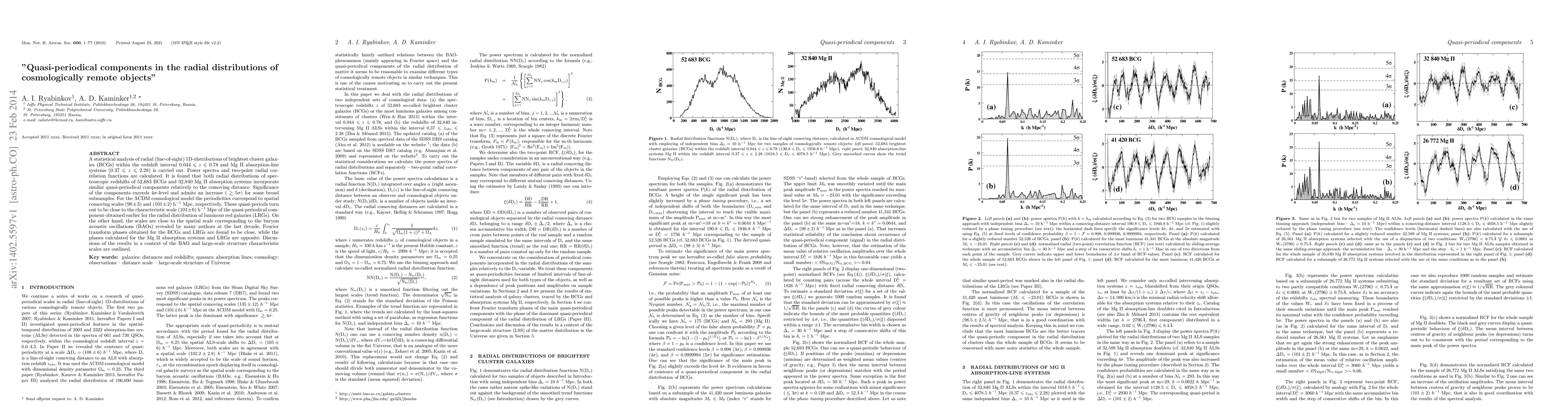 A statistical analysis of radial (line-of-sight) 1D-distributions of brightest cluster galaxies (BCGs) within the redshift interval $0.044 \leq z \leq 0.78$ and Mg II absorption-line systems ($0.37 \leq z \leq 2.28$) is carried out. Power spectra and two-point radial correlation functions are calculated. It is found that both radial distributions of spectroscopic redshifts of 52,683 BCGs and 32,840 Mg II absorption systems incorporate similar quasi-periodical components relatively to the comoving distance. Significance of the components exceeds $4\sigma$-level and admits an increase ($\geq 5\sigma$) for some broad subsamples. For the {\Lambda}CDM cosmological model the periodicities correspond to spatial comoving scales ($98 \pm 3$) and ($101 \pm 2$)h$^{-1}$ Mpc, respectively. These quasi-periods turn out to be close to the characteristic scale ($101 \pm 6$)h$^{-1}$Mpc of the quasi-periodical component obtained earlier for the radial distribution of luminous red galaxies (LRGs). On the other hand, the scales are close to the spatial scale corresponding to the baryon acoustic oscillations (BAOs) revealed by many authors at the last decade. Fourier transform phases obtained for the BCGs and LRGs are found to be close, while the phases calculated for the Mg II absorption systems and LRGs are opposite. Discussions of the results in a context of the BAO and large-scale structure characteristic scales are outlined.