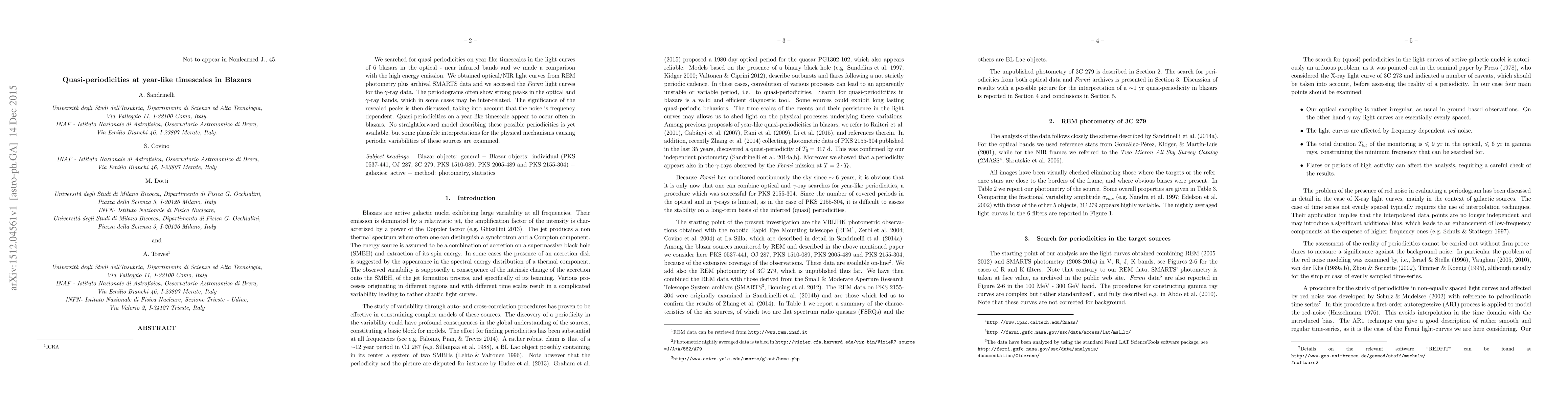 We searched for quasi-periodicities on year-like timescales in the light curves of 6 blazars in the optical - near infrared bands and we made a comparison with the high energy emission. We obtained optical/NIR light curves from REM photometry plus archival SMARTS data and we accessed the Fermi light curves for the $\gamma$-ray data. The periodograms often show strong peaks in the optical and gamma-ray bands, which in some cases may be inter-related. The significance of the revealed peaks is then discussed, taking into account that the noise is frequency dependent. Quasi-periodicities on a year-like timescale appear to occur often in blazars. No straightforward model describing these possible periodicities is yet available, but some plausible interpretations for the physical mechanisms causing periodic variabilities of these sources are examined.