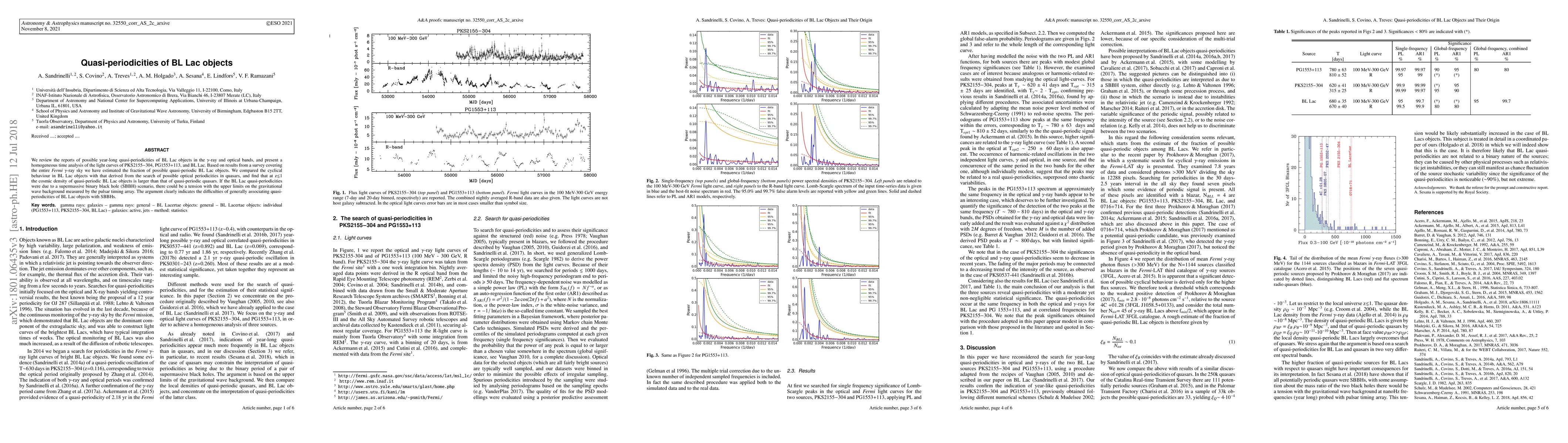 This paper reviews the evidence for year-long quasi-periodicities in BL Lac objects in $\gamma$-ray and optical bands, analyzing light curves of specific objects and estimating the fraction of such objects. The study finds a higher cosmic density of quasi-periodic BL Lac objects compared to quasars at low redshifts, suggesting challenges in linking these periodicities to supermassive binary black holes.