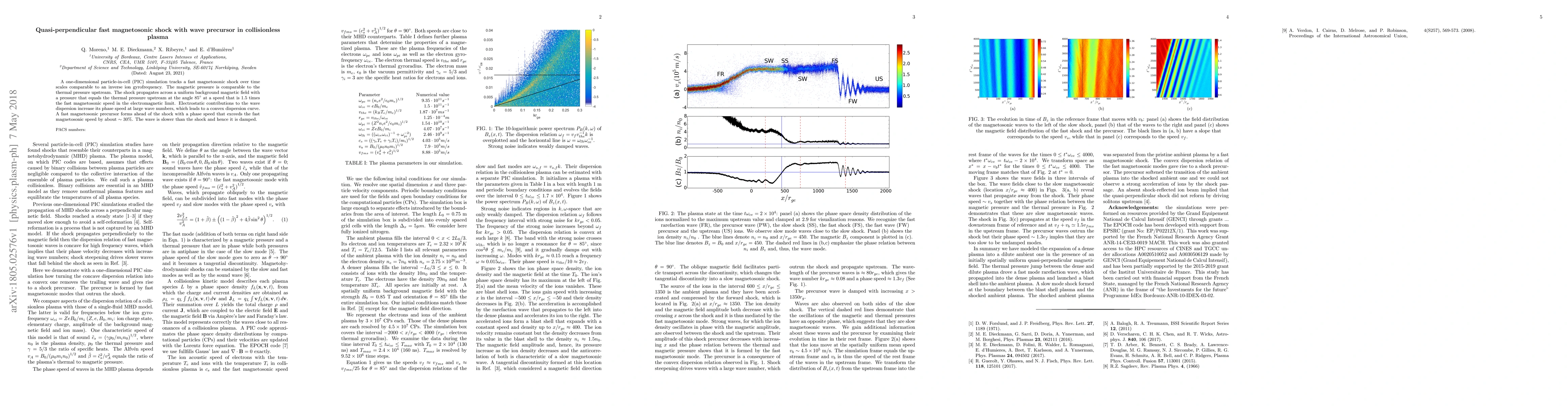A one-dimensional particle-in-cell (PIC) simulation tracks a fast magnetosonic shock over time scales comparable to an inverse ion gyrofrequency. The magnetic pressure is comparable to the thermal pressure upstream. The shock propagates across a uniform background magnetic field with a pressure that equals the thermal pressure upstream at the angle 85$^\circ$ at a speed that is 1.5 times the fast magnetosonic speed in the electromagnetic limit. Electrostatic contributions to the wave dispersion increase its phase speed at large wave numbers, which leads to a convex dispersion curve. A fast magnetosonic precursor forms ahead of the shock with a phase speed that exceeds the fast magnetosonic speed by about $\sim 30 \%$. The wave is slower than the shock and hence it is damped.