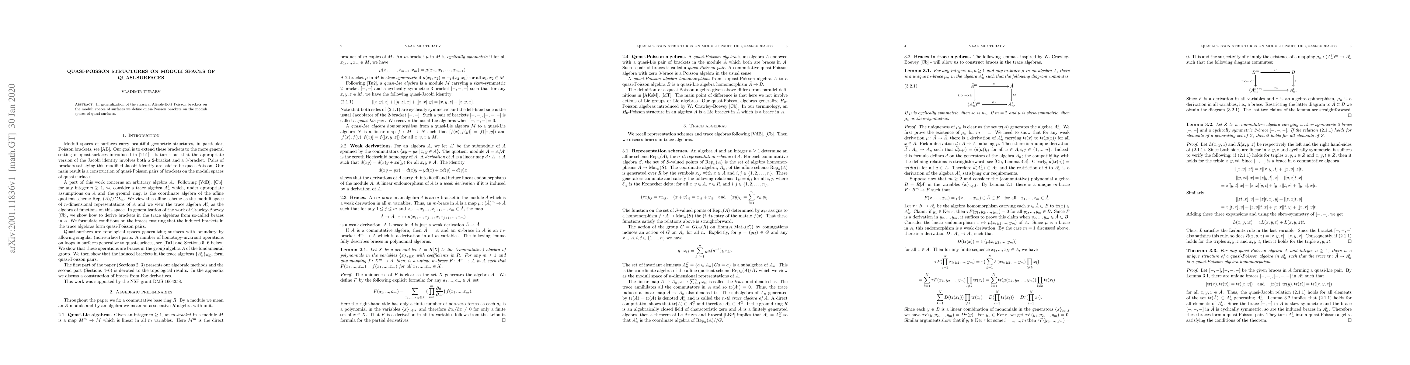 This paper introduces quasi-Poisson brackets on moduli spaces of quasi-surfaces, extending the classical Atiyah-Bott Poisson brackets traditionally defined on the moduli spaces of surfaces. This generalization aims to enhance the understanding of algebraic structures in these complex spaces.