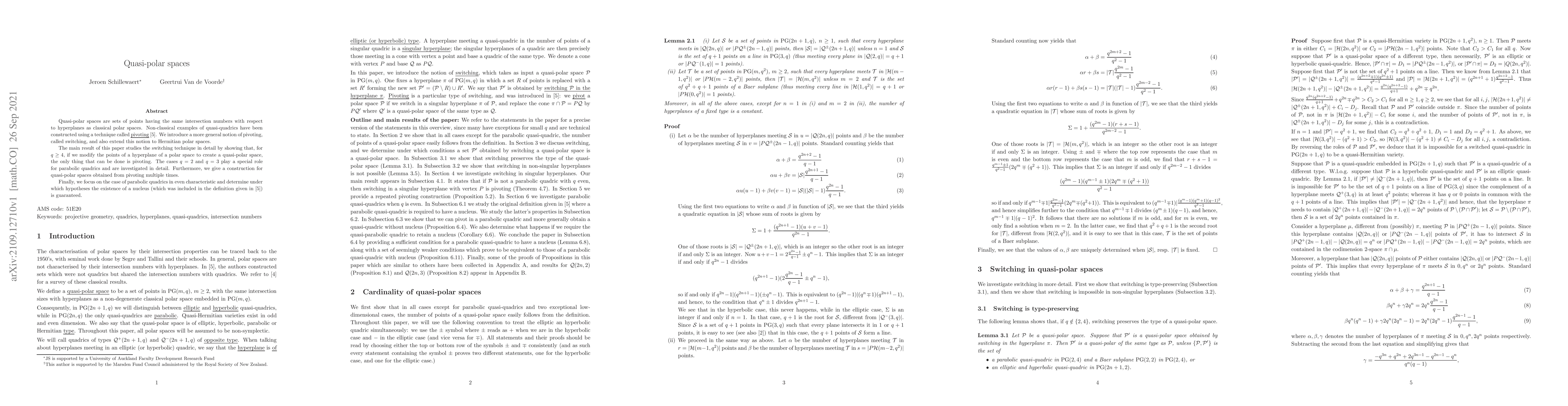 This paper introduces the concept of quasi-polar spaces, which share intersection properties with classical polar spaces, and explores a generalized pivoting technique called switching. It demonstrates that for q >= 4, modifying points of a hyperplane via pivoting is the only feasible method, while detailing special cases for q = 2 and q = 3, and constructing quasi-polar spaces through repeated pivoting.