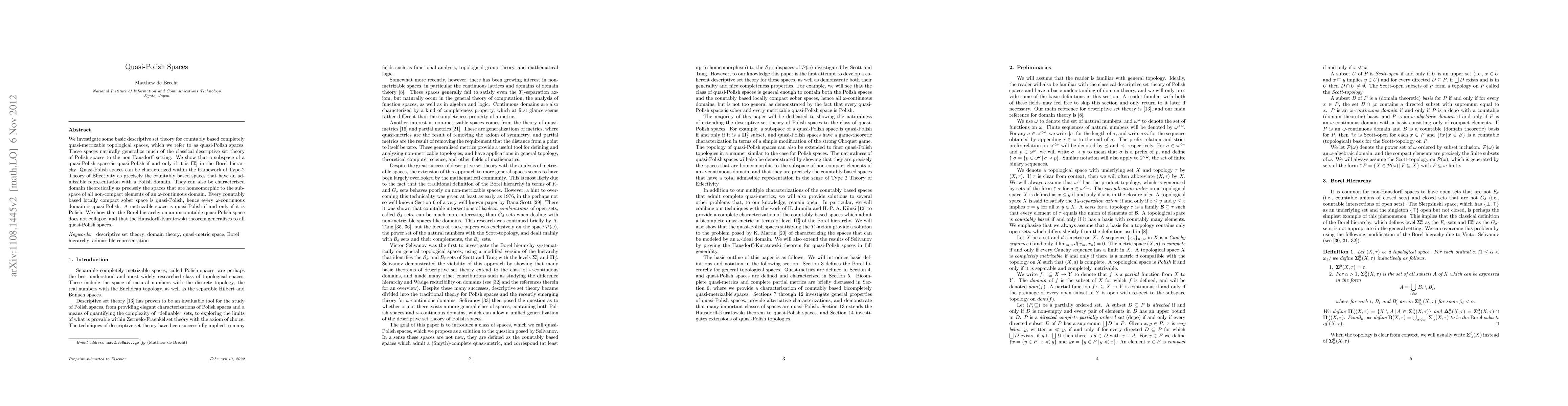 We investigate some basic descriptive set theory for countably based completely quasi-metrizable topological spaces, which we refer to as quasi-Polish spaces. These spaces naturally generalize much of the classical descriptive set theory of Polish spaces to the non-Hausdorff setting. We show that a subspace of a quasi-Polish space is quasi-Polish if and only if it is level \Pi_2 in the Borel hierarchy. Quasi-Polish spaces can be characterized within the framework of Type-2 Theory of Effectivity as precisely the countably based spaces that have an admissible representation with a Polish domain. They can also be characterized domain theoretically as precisely the spaces that are homeomorphic to the subspace of all non-compact elements of an \omega-continuous domain. Every countably based locally compact sober space is quasi-Polish, hence every \omega-continuous domain is quasi-Polish. A metrizable space is quasi-Polish if and only if it is Polish. We show that the Borel hierarchy on an uncountable quasi-Polish space does not collapse, and that the Hausdorff-Kuratowski theorem generalizes to all quasi-Polish spaces.