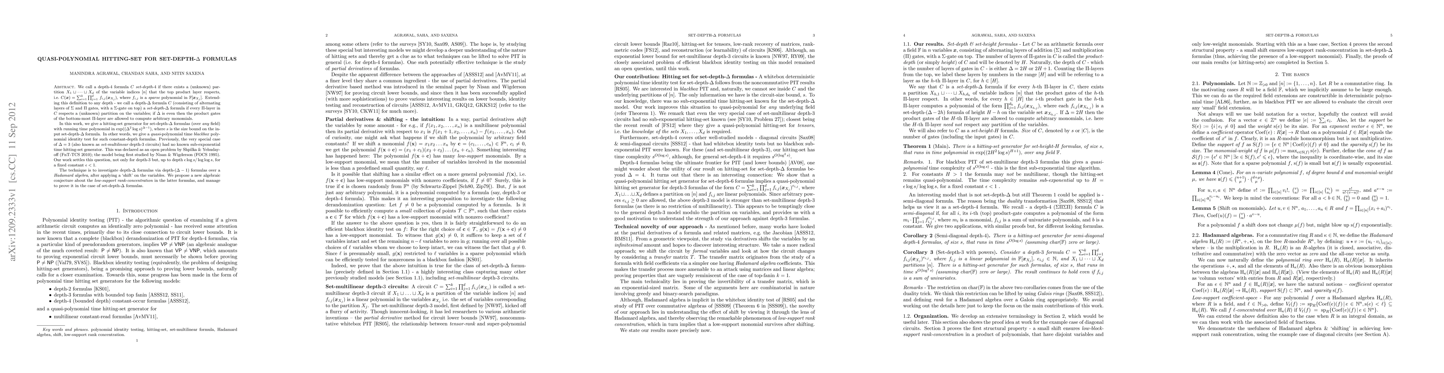 This paper presents a quasi-polynomial time hitting-set generator for set-depth-Delta formulas, resolving an open problem for depth-3 circuits. The method involves analyzing depth-Delta formulas through depth-(Delta-1) formulas over a Hadamard algebra, supported by a new algebraic conjecture on low-support rank-concentration.