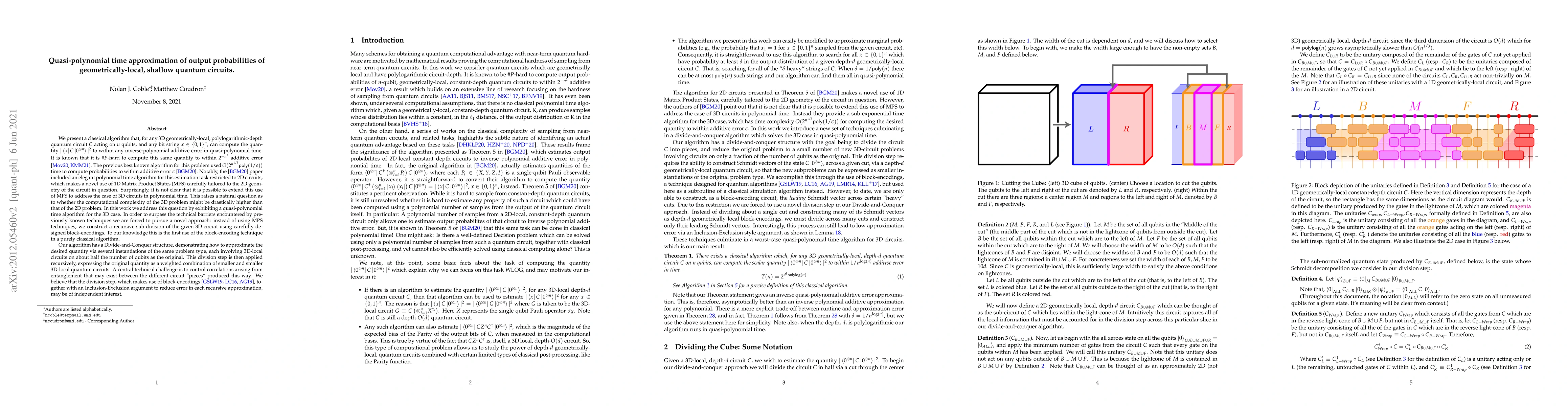We present a classical algorithm that, for any 3D geometrically-local, polylogarithmic-depth quantum circuit $C$ acting on $n$ qubits, and any bit string $x\in\{0,1\}^n$, can compute the quantity $|< x |C|0^{\otimes n}>|^2$ to within any inverse-polynomial additive error in quasi-polynomial time. It is known that it is $\#P$-hard to compute this same quantity to within $2^{-n^2}$ additive error [Mov20, KMM21]. The previous best known algorithm for this problem used $O(2^{n^{1/3}}\text{poly}(1/\epsilon))$ time to compute probabilities to within additive error $\epsilon$ [BGM20]. Notably, the [BGM20] paper included an elegant polynomial time algorithm for this estimation task restricted to 2D circuits, which makes a novel use of 1D Matrix Product States (MPS) carefully tailored to the 2D geometry of the circuit in question. Surprisingly, it is not clear that it is possible to extend this use of MPS to address the case of 3D circuits in polynomial time. This raises a natural question as to whether the computational complexity of the 3D problem might be drastically higher than that of the 2D problem. In this work we address this question by exhibiting a quasi-polynomial time algorithm for the 3D case. In order to surpass the technical barriers encountered by previously known techniques we are forced to pursue a novel approach. Our algorithm has a Divide-and-Conquer structure, demonstrating how to approximate the desired quantity via several instantiations of the same problem type, each involving 3D-local circuits on about half the number of qubits as the original. This division step is then applied recursively, expressing the original quantity as a weighted combination of smaller and smaller 3D-local quantum circuits. A central technical challenge is to control correlations arising from entanglement that may exist between the different circuit ``pieces" produced this way.