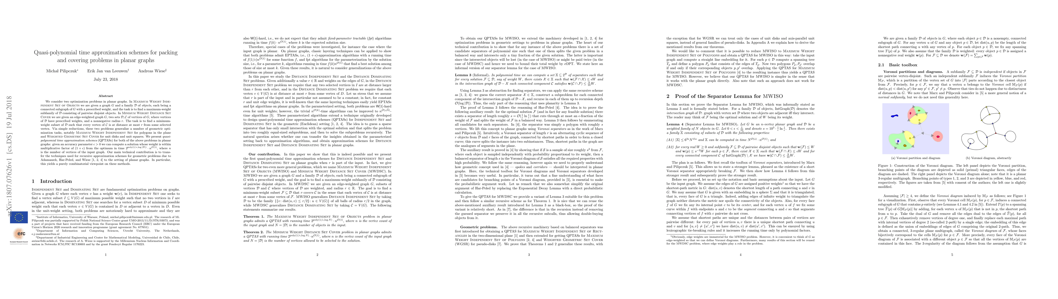 This paper presents quasi-polynomial time approximation schemes (QPTASs) for two optimization problems in planar graphs: Maximum Weight Independent Set of Objects and Minimum Weight Distance Set Cover. The authors achieve a solution within a multiplicative factor of $(1+\epsilon)$ of the optimum in time $2^{\mathrm{poly}(1/\epsilon,\log |\mathcal{D}|)}\cdot n^{\mathcal{O}(1)}$, leveraging techniques from geometric problems to provide a combinatorial approach.
