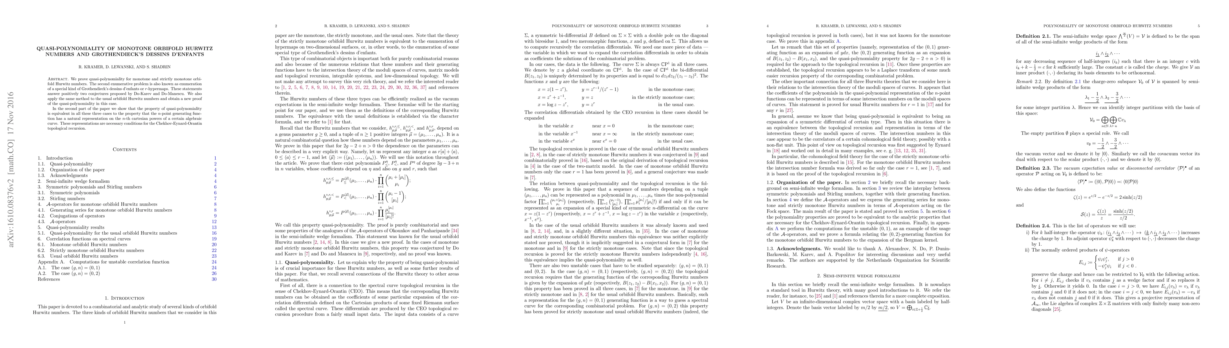 We prove quasi-polynomiality for monotone and strictly monotone orbifold Hurwitz numbers. The second enumerative problem is also known as enumeration of a special kind of Grothendieck's dessins d'enfants or $r$-hypermaps. These statements answer positively two conjectures proposed by Do-Karev and Do-Manescu. We also apply the same method to the usual orbifold Hurwitz numbers and obtain a new proof of the quasi-polynomiality in this case. In the second part of the paper we show that the property of quasi-polynomiality is equivalent in all these three cases to the property that the $n$-point generating function has a natural representation on the $n$-th cartesian powers of a certain algebraic curve. These representations are the necessary conditions for the Chekhov-Eynard-Orantin topological recursion.