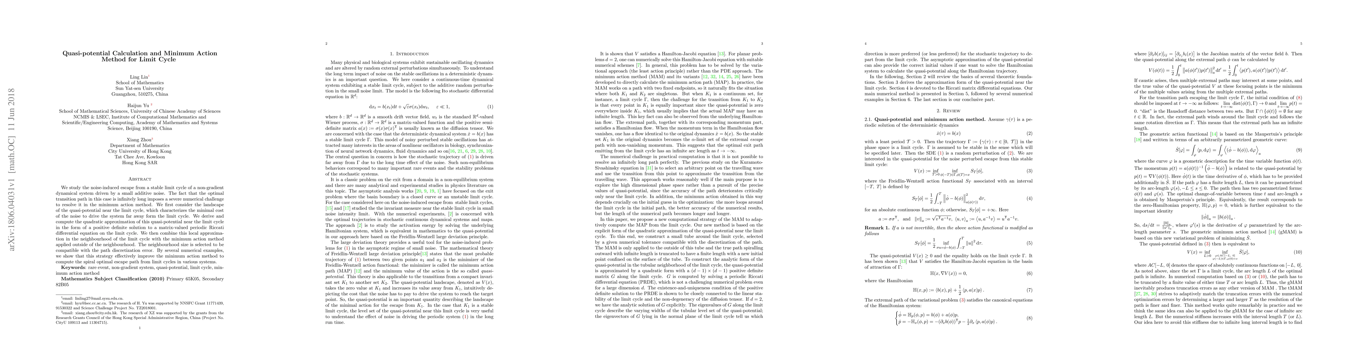 We study the noise-induced escape from a stable limit cycle of a non-gradient dynamical system driven by a small additive noise. The fact that the optimal transition path in this case is infinitely long imposes a severe numerical challenge to resolve it in the minimum action method. We first consider the landscape of the quasi-potential near the limit cycle, which characterizes the minimal cost of the noise to drive the system far away form the limit cycle. We derive and compute the quadratic approximation of this quasi-potential near the limit cy- cle in the form of a positive definite solution to a matrix-valued periodic Riccati differential equation on the limit cycle. We then combine this local approxima- tion in the neighbourhood of the limit cycle with the minimum action method applied outside of the neighbourhood. The neighbourhood size is selected to be compatible with the path discretization error. By several numerical examples, we show that this strategy effectively improve the minimum action method to compute the spiral optimal escape path from limit cycles in various systems.