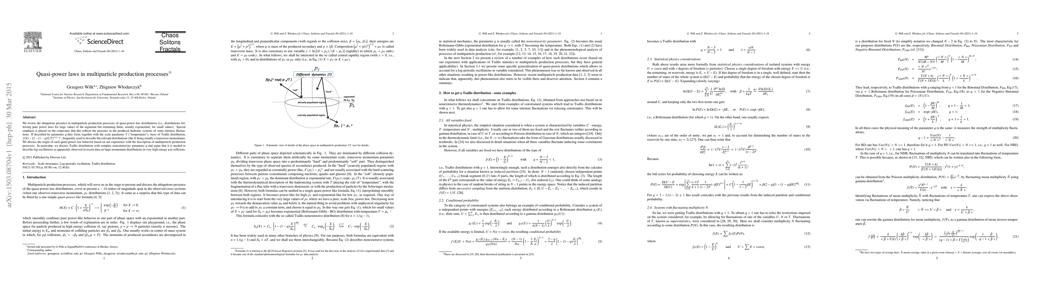 We review the ubiquitous presence in multiparticle production processes of quasi-power law distributions (i.e., distributions following pure power laws for large values of the argument but remaining finite, usually exponential, for small values). Special emphasis is placed on the conjecture that this reflects the presence in the produced hadronic systems of some intrinsic fluctuations. If described by parameter q they form, together with the scale parameter $T$ ("temperature"), basis of Tsallis distribution, ${f(X)\sim [1 - (1-q)X/T]^{1/(1-q)}}$, frequently used to describe the relevant distributions (the X being usually a transverse momentum). We discuss the origin of such quasi-power law behavior based on our experience with the description of multiparticle production processes. In particular, we discuss Tsallis distribution with complex nonextensivity parameter q and argue that it is needed to describe log-oscillations as apparently observed in recent data on large momentum distributions in very high energy p-p collisions.