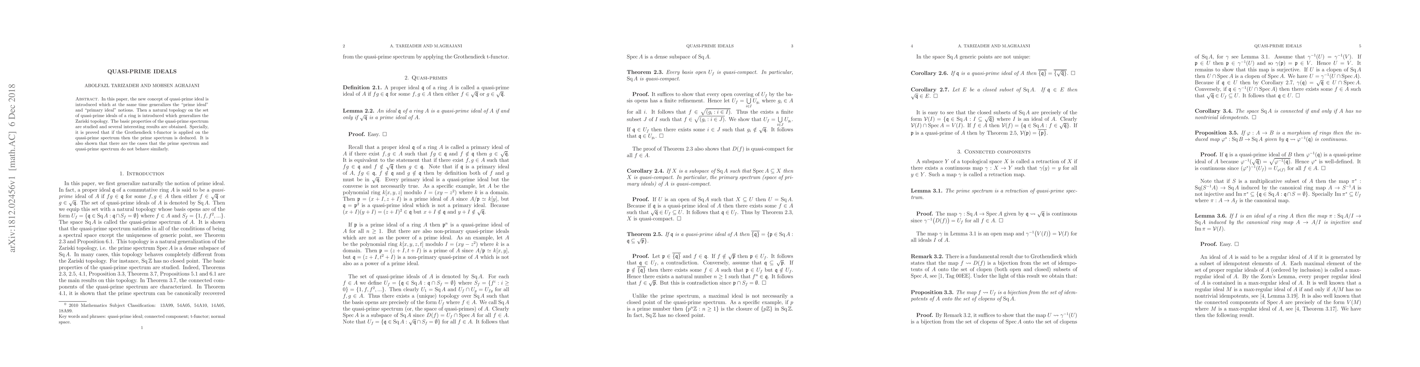 This paper introduces the concept of quasi-prime ideals, generalizing both prime and primary ideals, and studies their properties. It also develops a topology on the set of quasi-prime ideals, extending the Zariski topology, and demonstrates that applying the Grothendieck t-functor to the quasi-prime spectrum yields the prime spectrum, while highlighting cases where the two spectra differ.