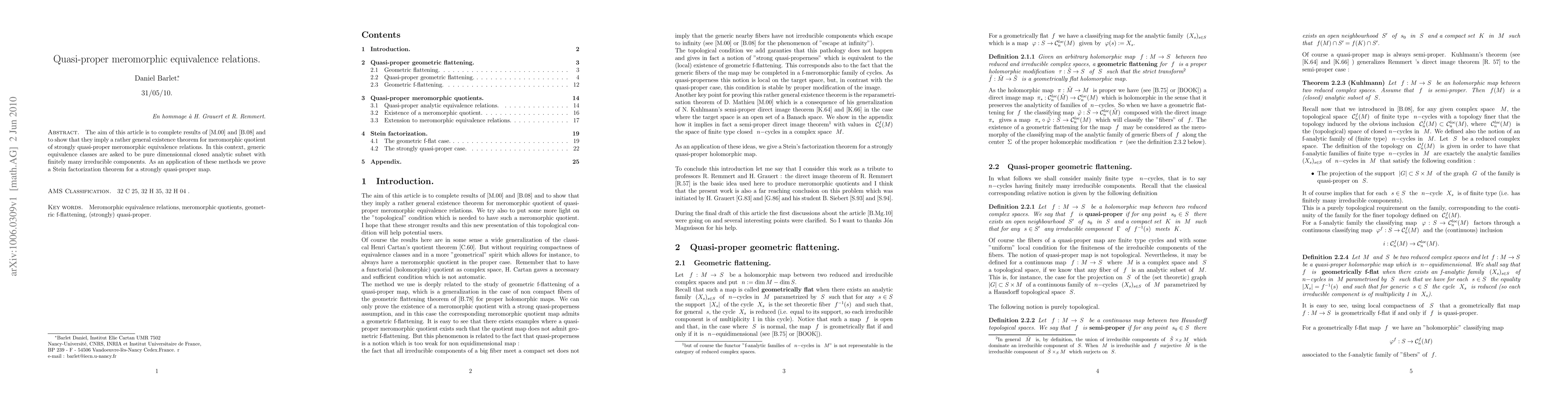 The aim of this article is to complete results of [M.00] and [B.08] and to show that they imply a rather general existence theorem for meromorphic quotient of strongly quasi-proper meromorphic equivalence relations. In this context, generic equivalence classes are asked to be pure dimensionnal closed analytic subset with finitely many irreducible components. As an application of these methods we prove a Stein factorization theorem for a strongly quasi-proper map