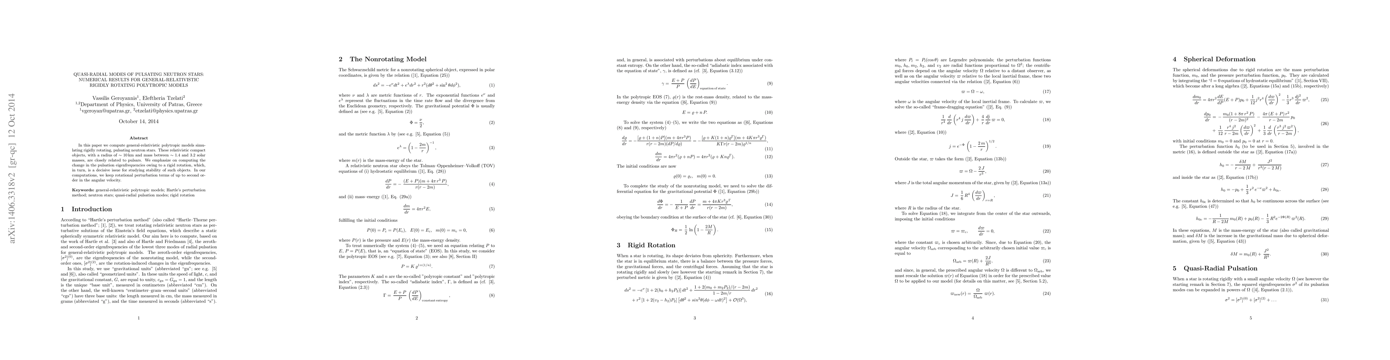 This paper investigates general-relativistic, rigidly rotating polytropic models of neutron stars, focusing on quasi-radial pulsation modes and the impact of rotation on their eigenfrequencies. The study highlights the importance of these eigenfrequency changes for understanding the stability of such relativistic compact objects.