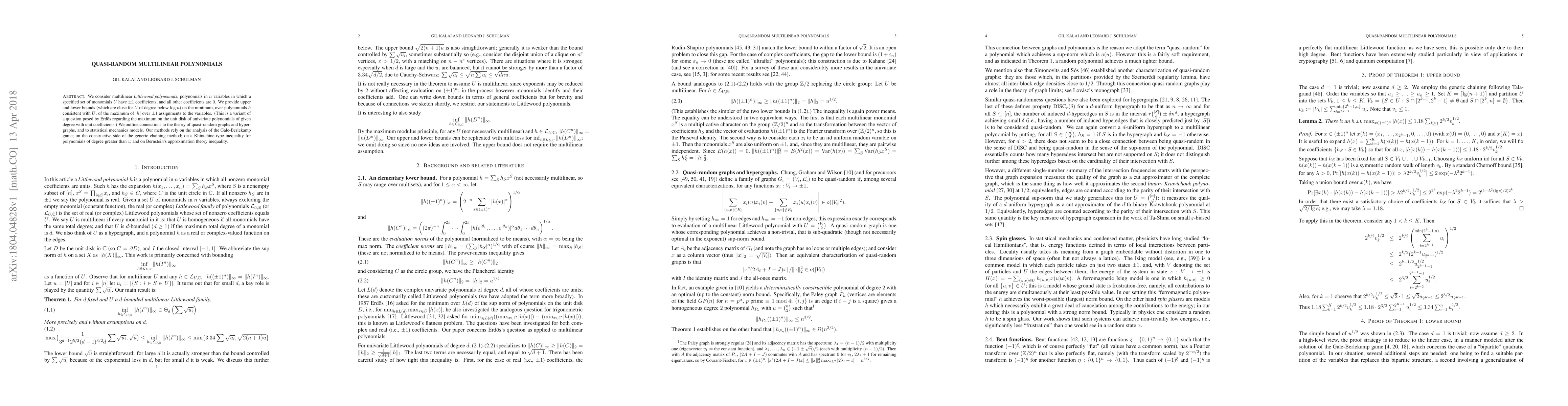 This paper studies multilinear Littlewood polynomials with specific monomials having $\pm 1$ coefficients and provides tight bounds for the maximum of $|h|$ over $\pm 1$ variable assignments. It connects these bounds to quasi-random graphs, hypergraphs, and statistical mechanics, using techniques from the Gale-Berlekamp game, generic chaining, and Bernstein's approximation theory.