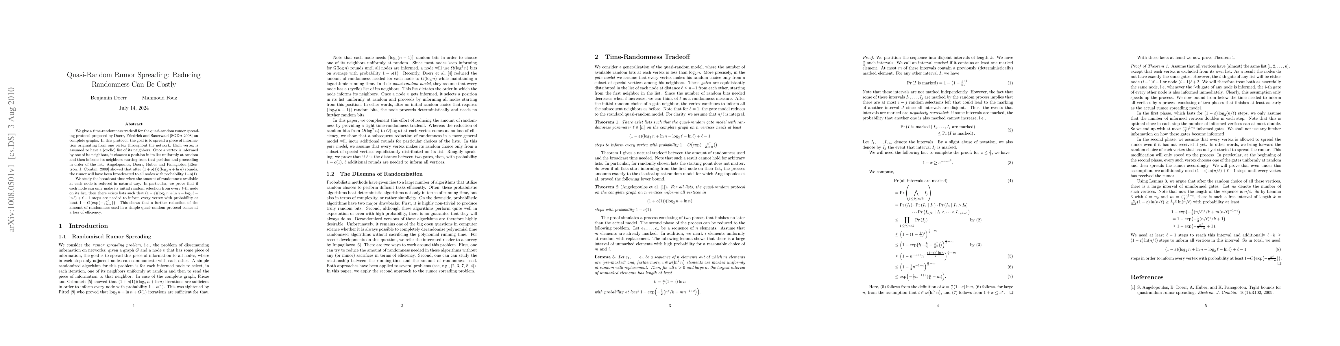 This paper explores the quasi-random rumor spreading protocol on complete graphs, demonstrating a time-randomness tradeoff. It shows that reducing the randomness used in the protocol by selecting neighbors from every $\ell$-th position increases the time needed to spread information, indicating that minimizing randomness can significantly affect efficiency.