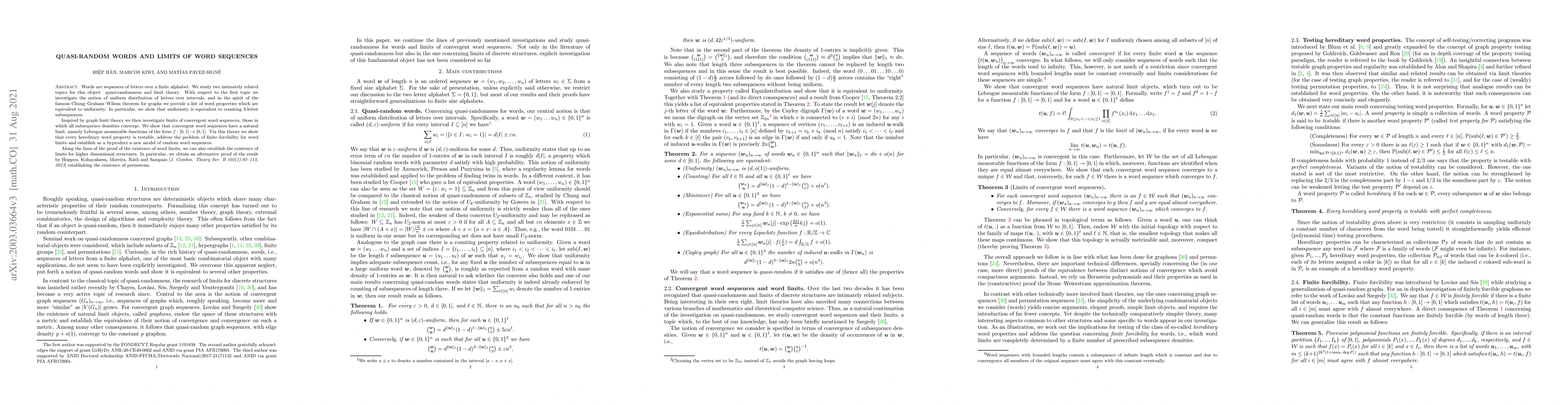 Words are sequences of letters over a finite alphabet. We study two intimately related topics for this object: quasi-randomness and limit theory. With respect to the first topic we investigate the notion of uniform distribution of letters over intervals, and in the spirit of the famous Chung--Graham--Wilson theorem for graphs we provide a list of word properties which are equivalent to uniformity. In particular, we show that uniformity is equivalent to counting 3-letter subsequences. Inspired by graph limit theory we then investigate limits of convergent word sequences, those in which all subsequence densities converge. We show that convergent word sequences have a natural limit, namely Lebesgue measurable functions of the form $f:[0,1]\to[0,1]$. Via this theory we show that every hereditary word property is testable, address the problem of finite forcibility for word limits and establish as a byproduct a new model of random word sequences. Along the lines of the proof of the existence of word limits, we can also establish the existence of limits for higher dimensional structures. In particular, we obtain an alternative proof of the result by Hoppen, Kohayakawa, Moreira, R\'ath and Sampaio [{\it J. Combin. Theory Ser. B 103(1):93--113, 2013}] establishing the existence of permutons.