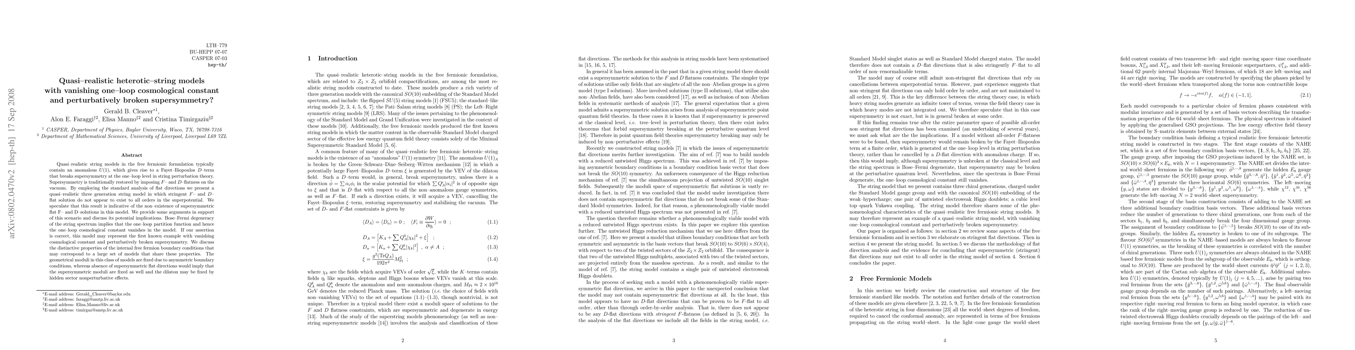Quasi-realistic string models in the free fermionic formulation typically contain an anomalous U(1), which gives rise to a Fayet-Iliopoulos D-term that breaks supersymmetry at the one--loop level in string perturbation theory. Supersymmetry is traditionally restored by imposing F- and D-flatness on the vacuum. By employing the standard analysis of flat directions we present a quasi--realistic three generation string model in which stringent F- and D-flat solution do not appear to exist to all orders in the superpotential. We speculate that this result is indicative of the non-existence of supersymmetric flat F- and D-solutions in this model. We provide some arguments in support of this scenario and discuss its potential implications. Bose-Fermi degeneracy of the string spectrum implies that the one--loop partition function and hence the one-loop cosmological constant vanishes in the model. If our assertion is correct, this model may represent the first known example with vanishing cosmological constant and perturbatively broken supersymmetry. We discuss the distinctive properties of the internal free fermion boundary conditions that may correspond to a large set of models that share these properties. The geometrical moduli in this class of models are fixed due to asymmetric boundary conditions, whereas absence of supersymmetric flat directions would imply that the supersymmetric moduli are fixed as well and the dilaton may be fixed by hidden sector nonperturbative effects.