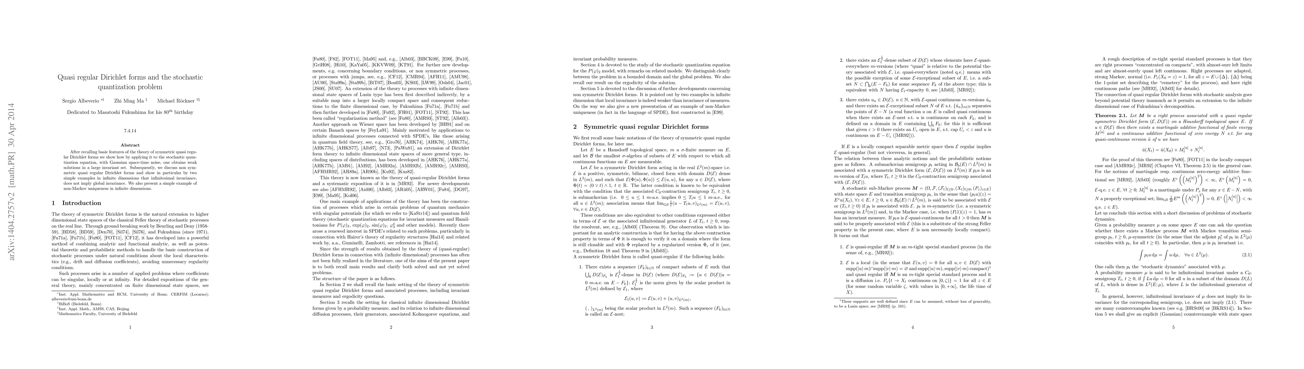 After recalling basic features of the theory of symmetric quasi regular Dirichlet forms we show how by applying it to the stochastic quantization equation, with Gaussian space-time noise, one obtains weak solutions in a large invariant set. Subsequently, we discuss non symmetric quasi regular Dirichlet forms and show in particular by two simple examples in infinite dimensions that infinitesimal invariance, does not imply global invariance. We also present a simple example of non-Markov uniqueness in infinite dimensions.