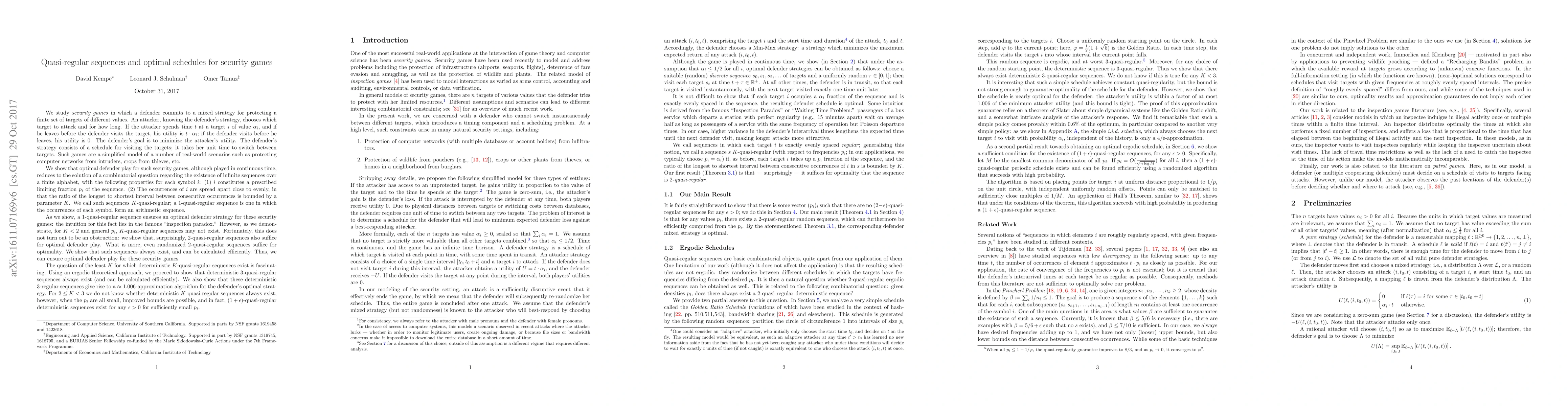 This research identifies that optimal strategies for defenders in security games, modeling scenarios like cybersecurity and crop protection, can be simplified to finding specific infinite sequences called K-quasi-regular sequences. Surprisingly, these sequences need only be '2-quasi-regular' for effectiveness, and even randomized versions work. The study confirms the existence and efficient calculation of such sequences, and further reveals deterministic 3-quasi-regular sequences always exist, though existence for 2 <= K < 3 remains unconfirmed.