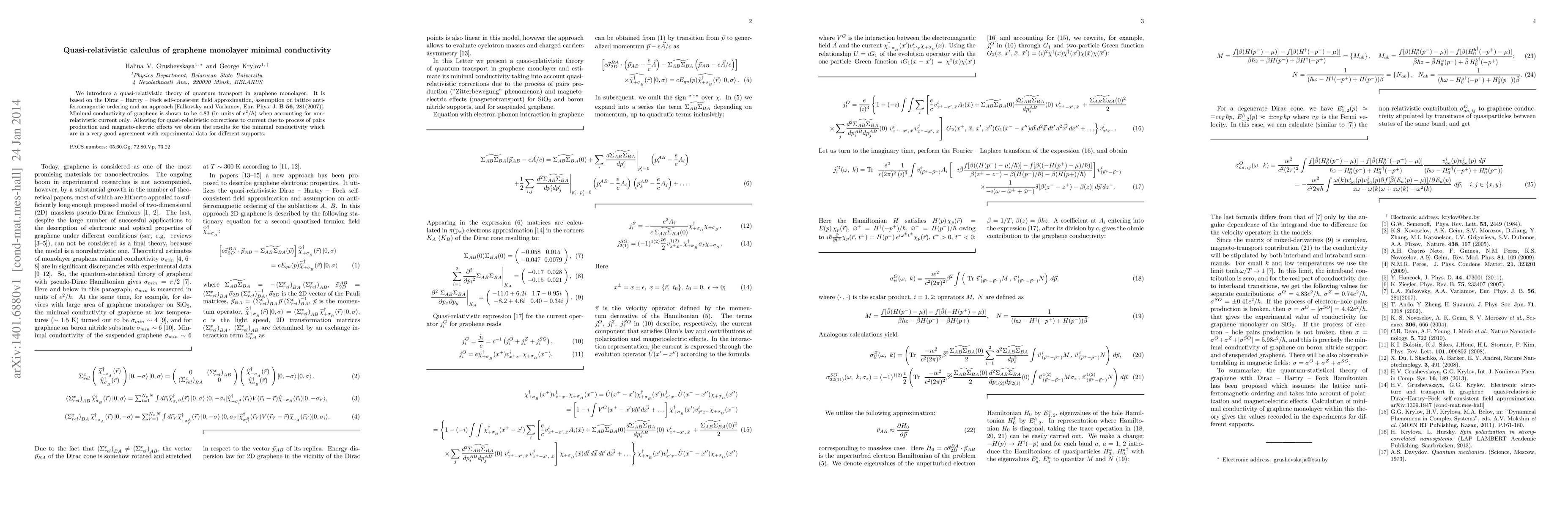 We introduce a quasi-relativistic theory of quantum transport in graphene monolayer. It is based on the Dirac -- Hartry -- Fock self-consistent field approximation, assumption on lattice anti-ferromagnetic ordering and an approach [Falkovsky and Varlamov, Eur.~Phys.~J. {\bf B 56}, 281(2007)]. Minimal conductivity of graphene is shown to be $4.83$ (in units of $e^2/h$) when accounting for non-relativistic current only. Allowing for quasi-relativistic corrections to current due to process of pairs production and magneto-electric effects we obtain the results for the minimal conductivity which are in a very good agreement with experimental data for different supports.