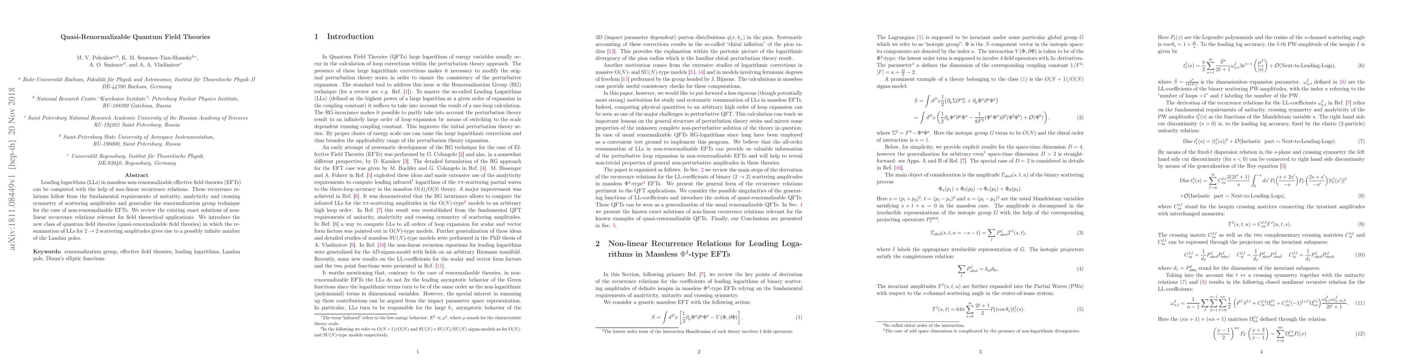 This paper reviews exact solutions for non-linear recurrence relations in massless non-renormalizable effective field theories, emphasizing the computation of leading logarithms. It introduces quasi-renormalizable quantum field theories, where resummation of leading logarithms may lead to an infinite number of Landau poles.