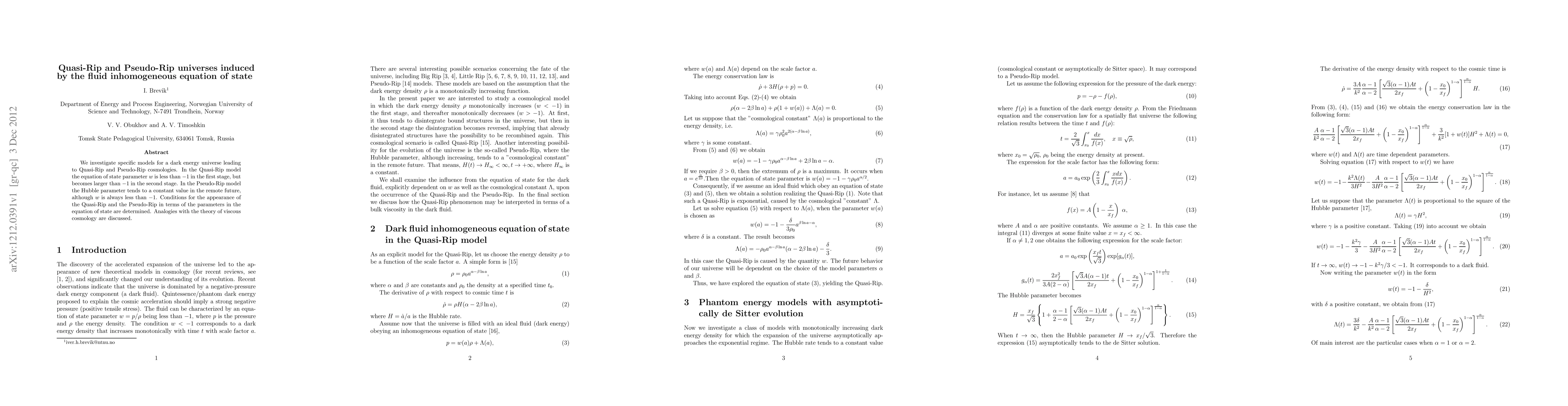 This paper explores dark energy models resulting in Quasi-Rip and Pseudo-Rip cosmologies, where the equation of state parameter transitions in the former and remains below -1 in the latter, with the Hubble parameter stabilizing. Conditions for these cosmological models are derived based on the fluid inhomogeneous equation of state, and connections to viscous cosmology are analyzed.