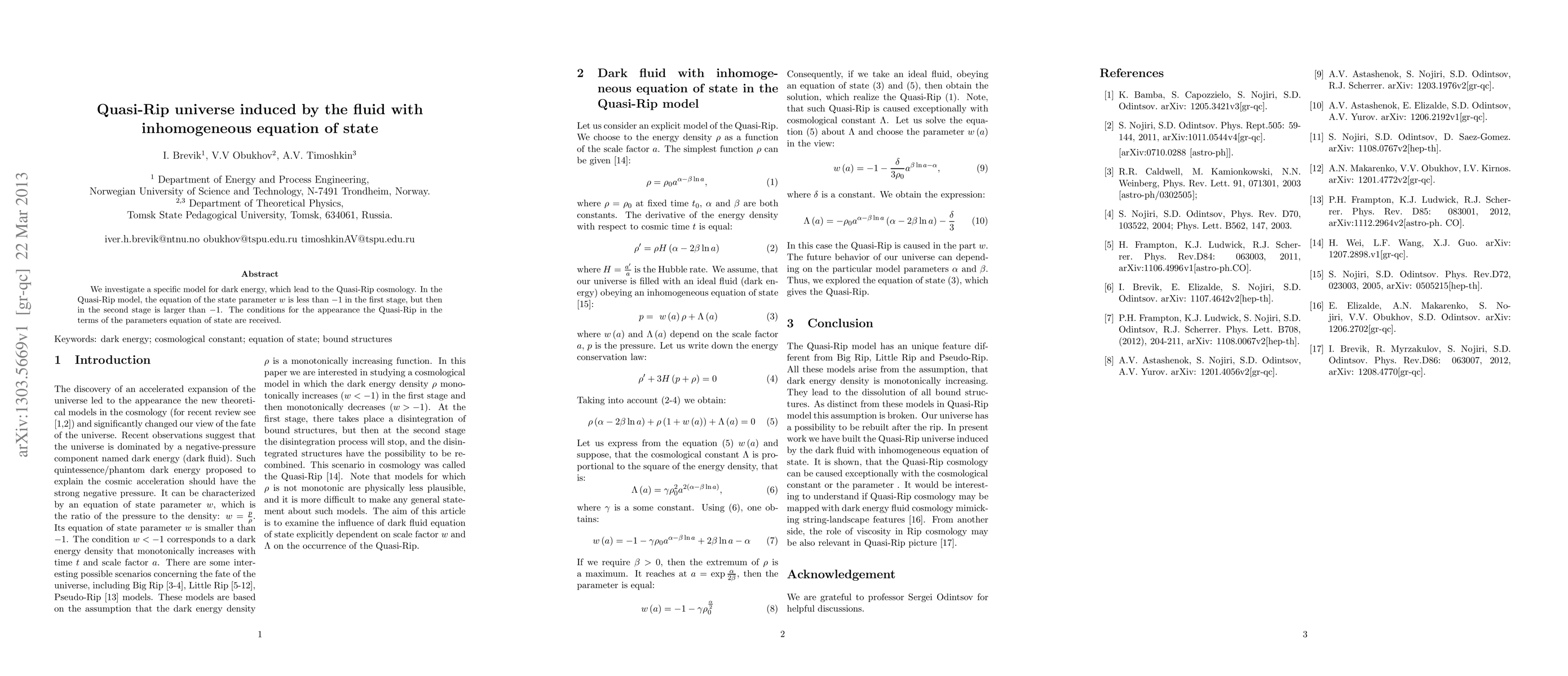 Summary: This paper explores a dark energy model leading to Quasi-Rip cosmology, where the equation of state parameter $w$ transitions from < -1 to > -1, detailing the parameters conditions for the Quasi-Rip phenomenon.