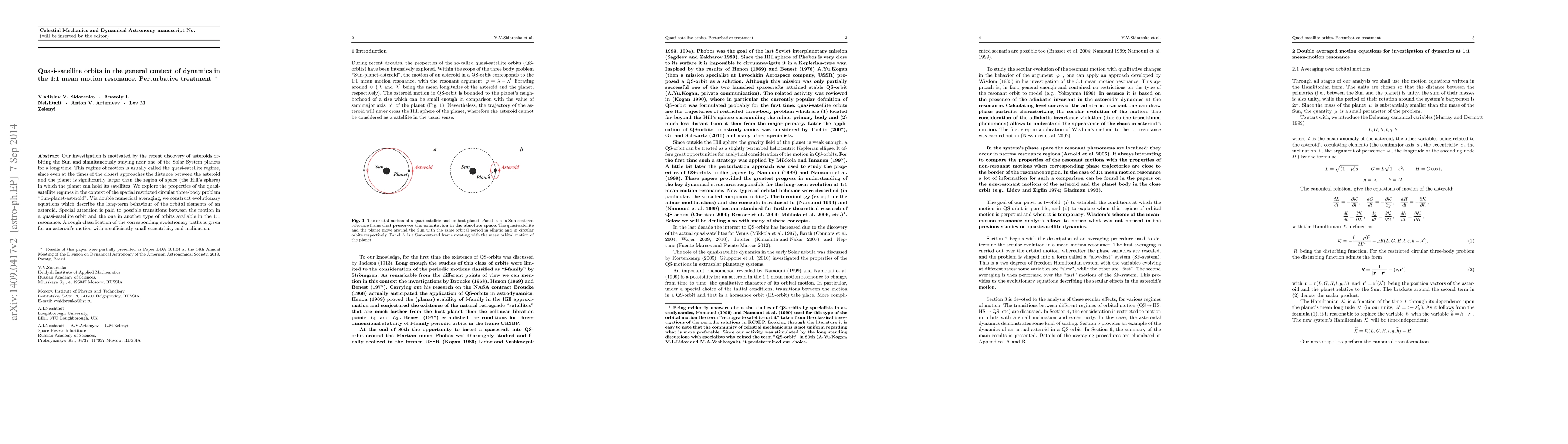 This paper investigates quasi-satellite orbits in the 1:1 mean motion resonance, focusing on the dynamics of asteroids that stay near a planet for extended periods. Using double numerical averaging, it constructs evolutionary equations to describe the long-term behavior of these orbits and explores transitions between quasi-satellite and other types of resonant orbits.
