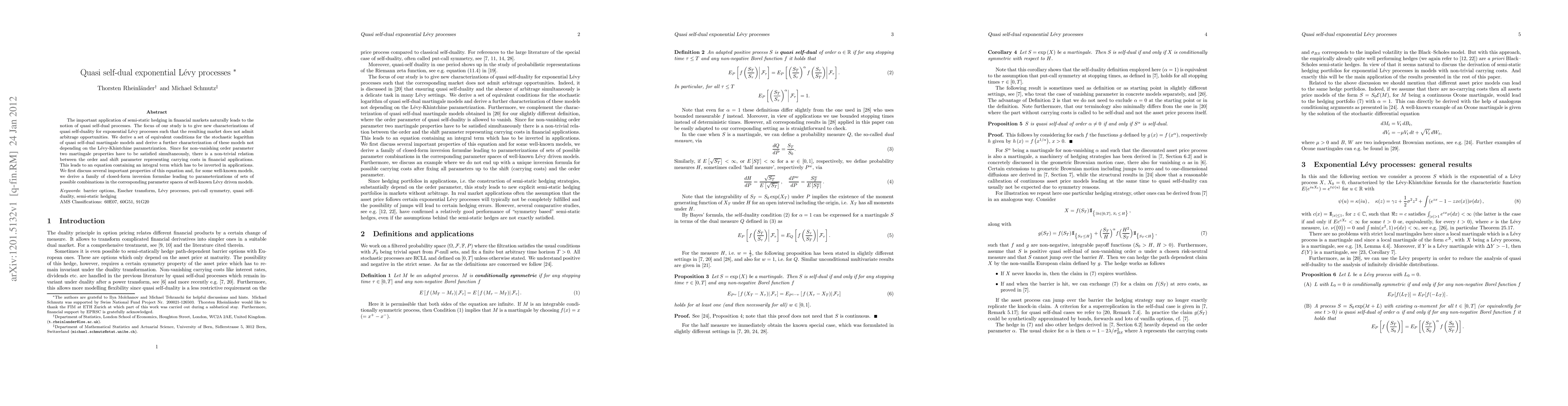 The important application of semi-static hedging in financial markets naturally leads to the notion of quasi self-dual processes. The focus of our study is to give new characterizations of quasi self-duality for exponential L\'evy processes such that the resulting market does not admit arbitrage opportunities. We derive a set of equivalent conditions for the stochastic logarithm of quasi self-dual martingale models and derive a further characterization of these models not depending on the L\'evy-Khintchine parametrization. Since for non-vanishing order parameter two martingale properties have to be satisfied simultaneously, there is a non-trivial relation between the order and shift parameter representing carrying costs in financial applications. This leads to an equation containing an integral term which has to be inverted in applications. We first discuss several important properties of this equation and, for some well-known models, we derive a family of closed-form inversion formulae leading to parameterizations of sets of possible combinations in the corresponding parameter spaces of well-known L\'evy driven models.