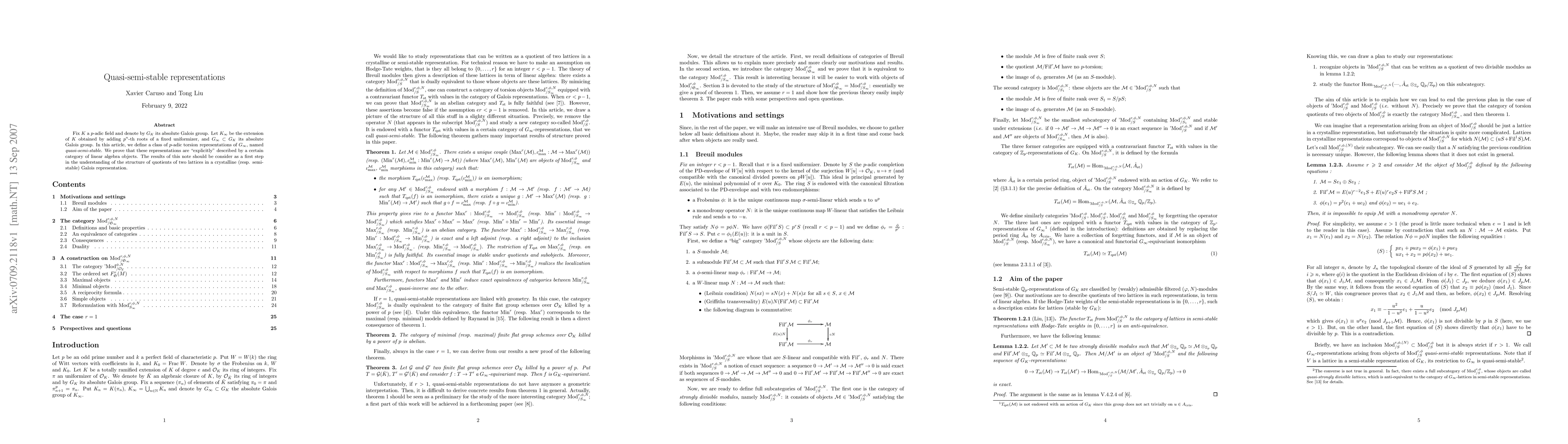 Fix K a p-adic field and denote by G_K its absolute Galois group. Let K_infty be the extension of K obtained by adding (p^n)-th roots of a fixed uniformizer, and G_\infty its absolute Galois group. In this article, we define a class of p-adic torsion representations of G_\infty, named quasi-semi-stable. We prove that these representations are "explicitly" described by a certain category of linear algebra objects. The results of this note should be consider as a first step in the understanding of the structure of quotients of two lattices in a crystalline (resp. semi-stable) Galois representation.