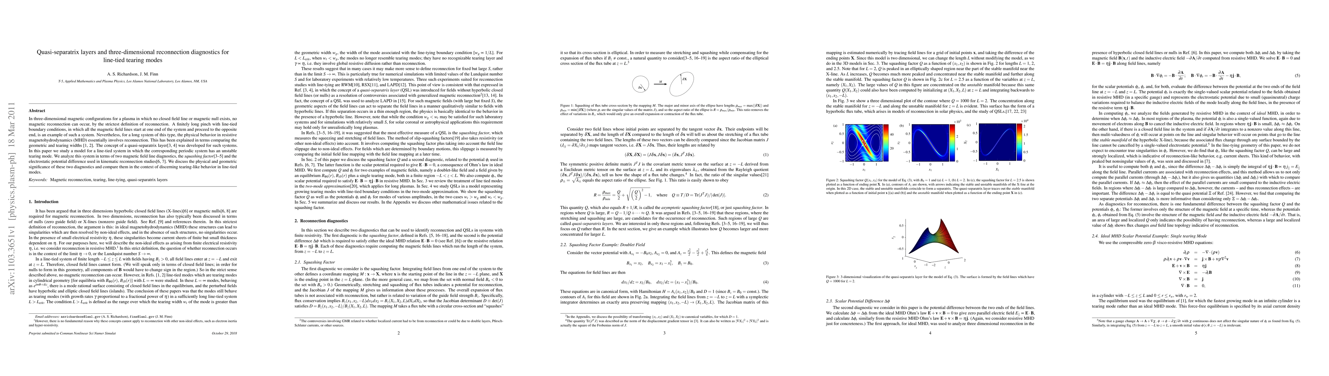In three-dimensional magnetic configurations for a plasma in which no closed field line or magnetic null exists, no magnetic reconnection can occur, by the strictest definition of reconnection. A finitely long pinch with line-tied boundary conditions, in which all the magnetic field lines start at one end of the system and proceed to the opposite end, is an example of such a system. Nevertheless, for a long system of this type, the physical behavior in resistive magnetohydrodynamics (MHD) essentially involves reconnection. This has been explained in terms comparing the geometric and tearing widths [1, 2]. The concept of a quasi-separatrix layer[3, 4] was developed for such systems. In this paper we study a model for a line-tied system in which the corresponding periodic system has an unstable tearing mode. We analyze this system in terms of two magnetic field line diagnostics, the squashing factor[3-5] and the electrostatic potential difference used in kinematic reconnection studies[6, 7]. We discuss the physical and geometric significance of these two diagnostics and compare them in the context of discerning tearing-like behavior in line-tied modes. [1] G. L. Delzanno and J. M. Finn. Physics of Plasmas, 15(3):032904, 2008. [2] Y.-M. Huang and E. G. Zweibel. Physics of Plasmas, 16(4):042102, 2009. [3] E. R. Priest and P. D\'emoulin. J. Geophys. Res., 100(A12):23443-23463, 1995. [4] P. D\'emoulin, J. C. Henoux, E. R. Priest, and C. H. Mandrini. Astron. Astrophys., 308:643-655, Apr. 1996. [5] V. S. Titov and G. Hornig. Advances in Space Research, 29(7):1087-1092, 2002. [6] Y. Lau and J. M. Finn. The Astrophysical Journal, 350:672-691, Feb. 1990. [7] Y. Lau and J. M. Finn. The Astrophysical Journal, 366:577-591, 1991.