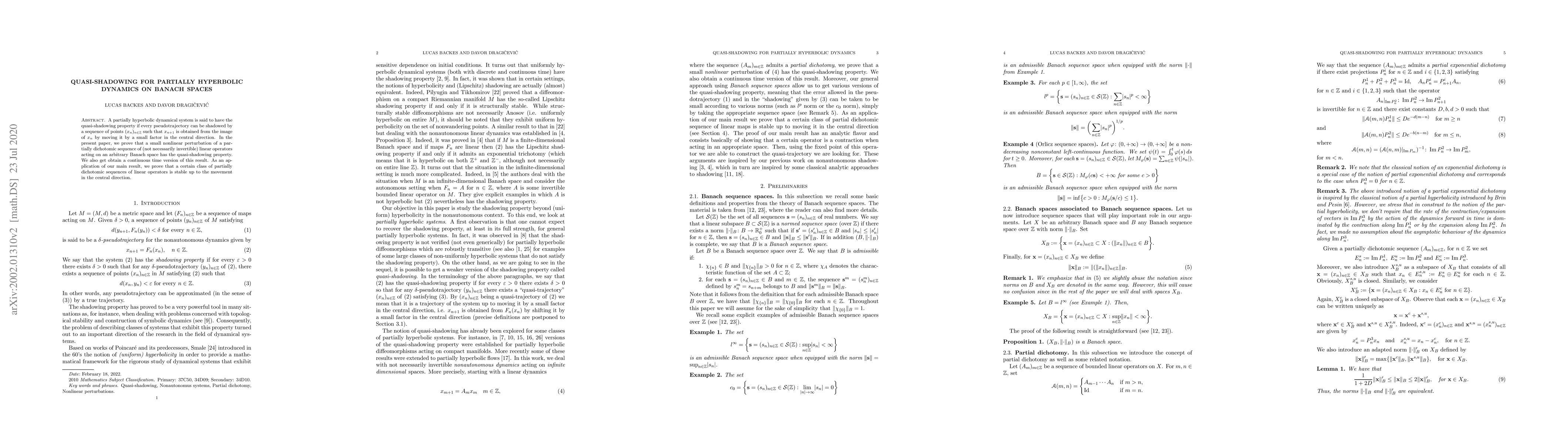 This paper proves that a small nonlinear perturbation of partially dichotomic sequences of linear operators on Banach spaces exhibits the quasi-shadowing property. It also extends this result to continuous time and demonstrates stability of a class of such sequences under central direction movement.