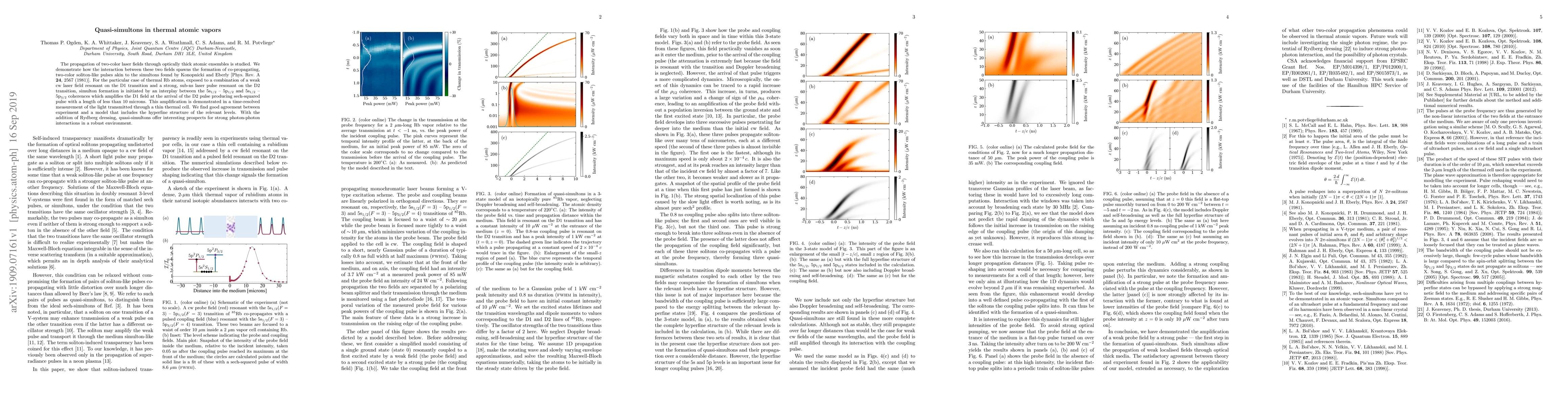 The propagation of two-color laser fields through optically thick atomic ensembles is studied. We demonstrate how the interaction between these two fields spawns the formation of co-propagating, two-color soliton-like pulses akin to the simultons found by Konopnicki and Eberly [Phys. Rev. A 24, 2567 (1981)]. For the particular case of thermal Rb atoms, exposed to a combination of a weak cw laser field resonant on the D1 transition and a strong, sub-ns laser pulse resonant on the D2 transition, simulton formation is initiated by an interplay between the 5s_{1/2} -- 5p_{1/2} and 5s_{1/2} -- 5p_{3/2} coherences which amplifies the D1 field at the arrival of the D2 pulse producing sech-squared pulse with a length of less than 10 microns. This amplification is demonstrated in a time-resolved measurement of the light transmitted through a thin thermal cell. We find good agreement between experiment and a model that includes the hyperfine structure of the relevant levels. With the addition of Rydberg dressing, quasi-simultons offer interesting prospects for strong photon-photon interactions in a robust environment.