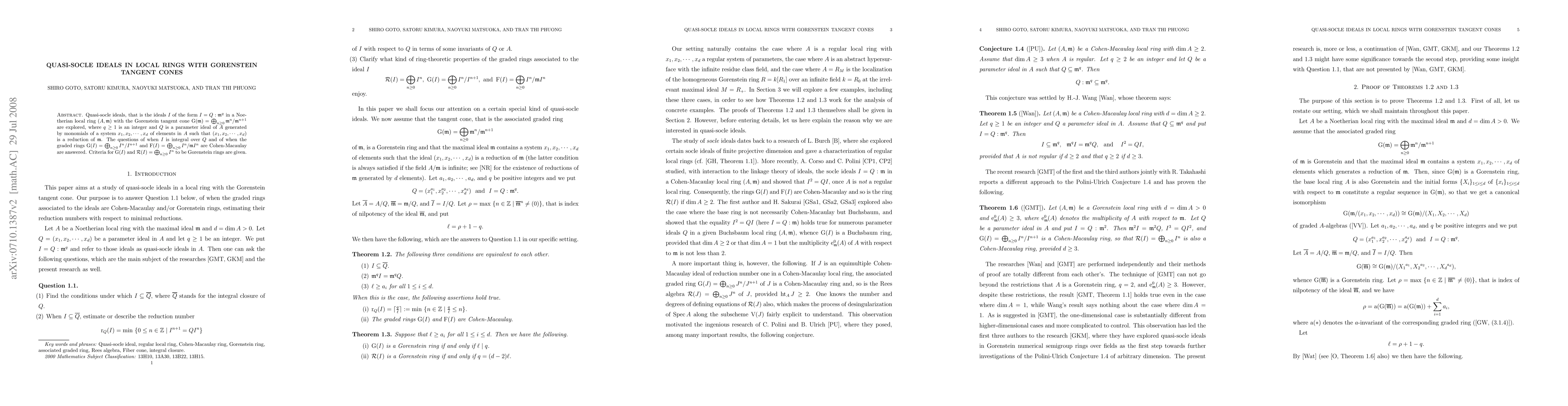Quasi-socle ideals, that is the ideals $I$ of the form $I= Q : \mathfrak{m}^q$ in a Noetherian local ring $(A, \mathfrak{m})$ with the Gorenstein tangent cone $\mathrm{G}(\mathfrak{m}) = \bigoplus_{n \geq 0}{\mathfrak{m}}^n/{\mathfrak{m}}^{n+1}$ are explored, where $q \geq 1$ is an integer and $Q$ is a parameter ideal of $A$ generated by monomials of a system $x_1, x_2, ..., x_d$ of elements in $A$ such that $(x_1, x_2, ..., x_d)$ is a reduction of $\mathfrak{m}$. The questions of when $I$ is integral over $Q$ and of when the graded rings $\mathrm{G}(I) = \bigoplus_{n \geq 0}I^n/I^{n+1}$ and $\mathrm{F}(I) = \bigoplus_{n \ge 0}I^n/\mathfrak{m} I^n$ are Cohen-Macaulay are answered. Criteria for $\mathrm{G} (I)$ and $\mathcal{R} (I) = \bigoplus_{n \geq 0}I^n$ to be Gorenstein rings are given.