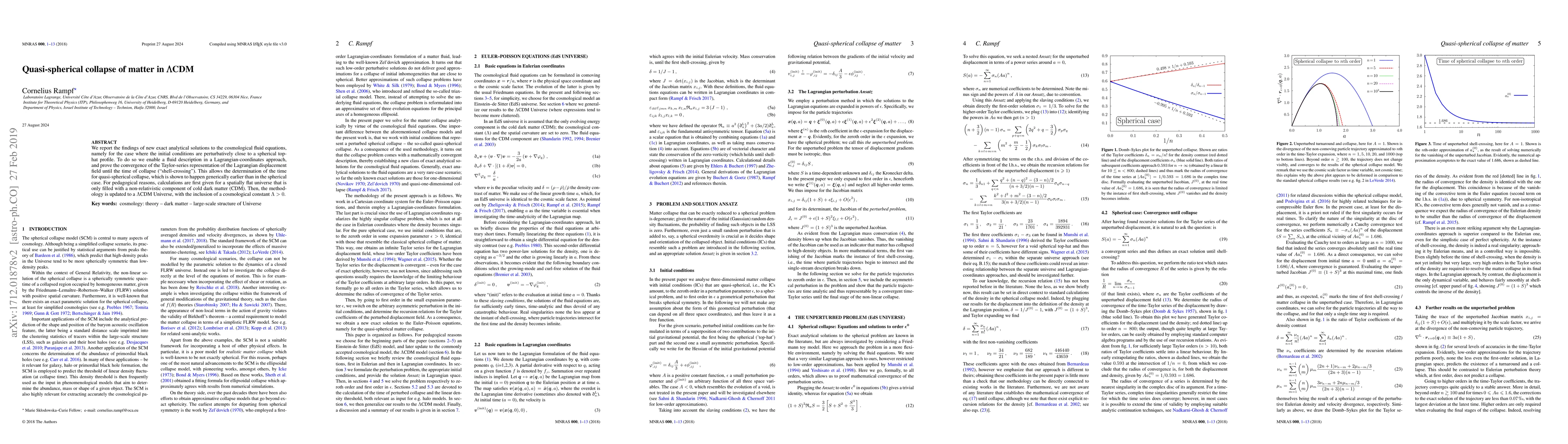 We report the findings of new exact analytical solutions to the cosmological fluid equations, namely for the case where the initial conditions are perturbatively close to a spherical top-hat profile. To do so we enable a fluid description in a Lagrangian-coordinates approach, and prove the convergence of the Taylor-series representation of the Lagrangian displacement field until the time of collapse ("shell-crossing"). This allows the determination of the time for quasi-spherical collapse, which is shown to happen generically earlier than in the spherical case. For pedagogical reasons, calculations are first given for a spatially flat universe that is only filled with a non-relativistic component of cold dark matter (CDM). Then, the methodology is updated to a $\Lambda$CDM Universe, with the inclusion of a cosmological constant $\Lambda>0$.