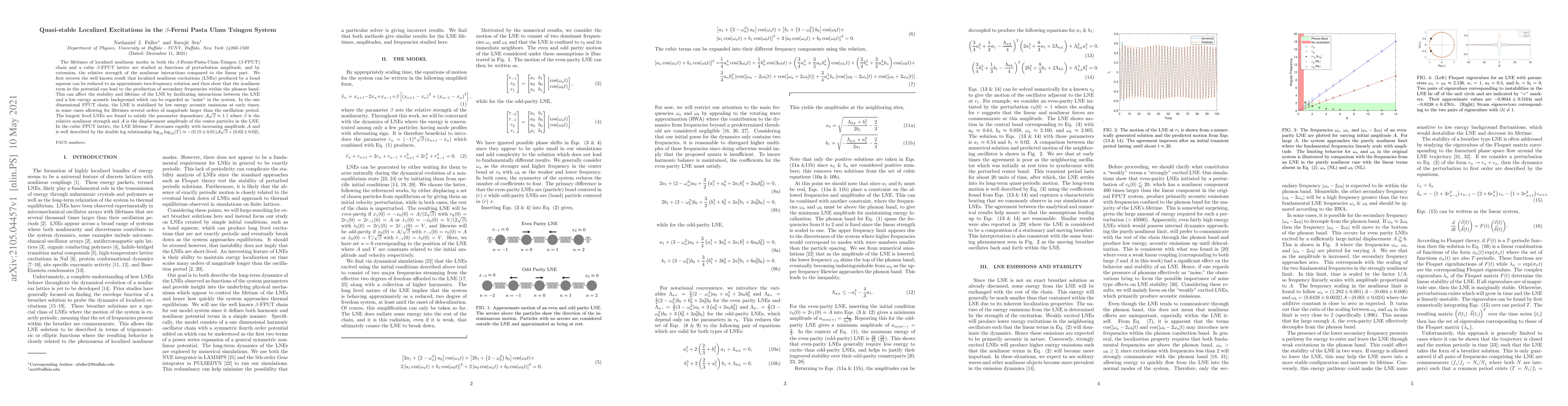 This paper investigates the lifetimes of localized nonlinear excitations in the $\beta$-FPUT system, showing that the nonlinear potential can generate secondary frequencies affecting stability. In the one-dimensional chain, low-energy acoustic emissions stabilize excitations, leading to significantly longer lifetimes, while in the cubic lattice, lifetimes decrease rapidly with amplitude, following a double log relationship.