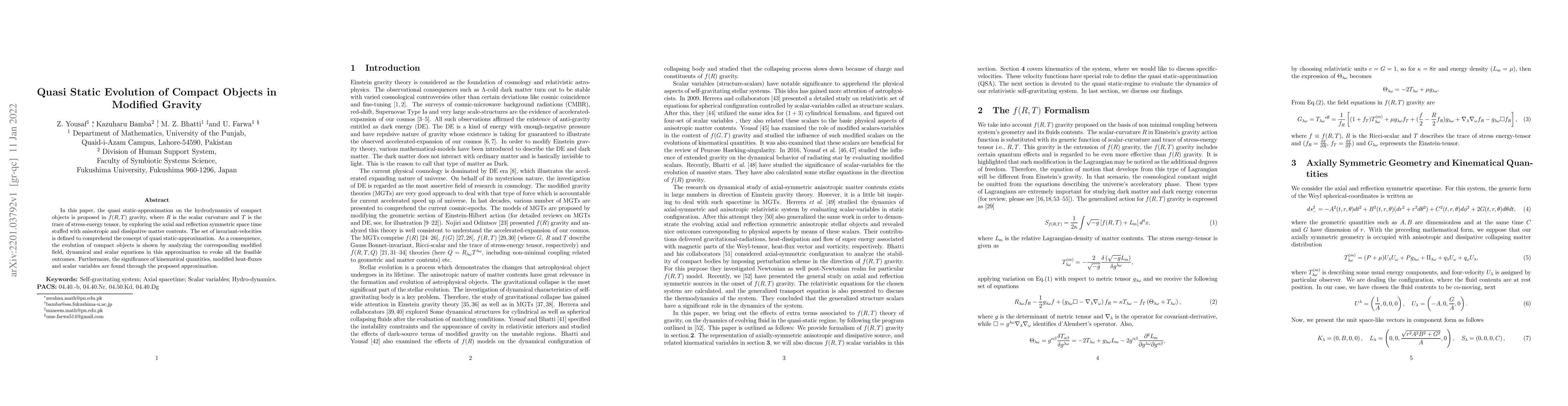 In this paper, the quasi static-approximation on the hydrodynamics of compact objects is proposed in $f(R, T)$ gravity, where $R$ is the scalar curvature and $T$ is the trace of stress-energy tensor, by exploring the axial and reflection symmetric space time stuffed with anisotropic and dissipative matter contents. The set of invariant-velocities is defined to comprehend the concept of quasi static-approximation. As a consequence, the evolution of compact objects is shown by analyzing the corresponding modified field, dynamical and scalar equations in this approximation to evoke all the feasible outcomes. Furthermore, the significance of kinematical quantities, modified heat-fluxes and scalar variables are found through the proposed approximation.