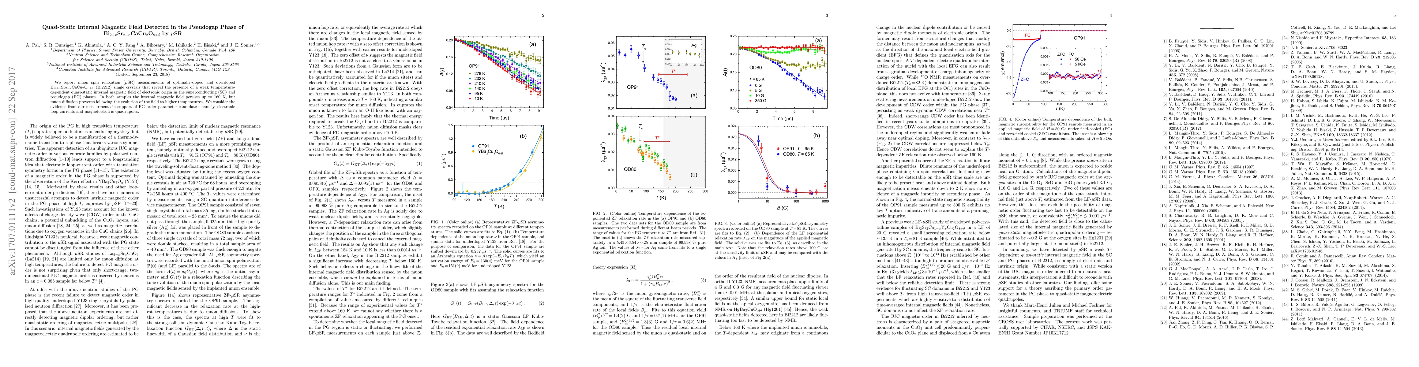 We report muon spin relaxation ($\mu$SR) measurements of optimally-doped and overdoped Bi$_{2+x}$Sr$_{2-x}$CaCu$_2$O$_{8+\delta}$ (Bi2212) single crystals that reveal the presence of a weak temperature-dependent quasi-static internal magnetic field of electronic origin in the superconducting (SC) and pseudogap (PG) phases. In both samples the internal magnetic field persists up to 160~K, but muon diffusion prevents following the evolution of the field to higher temperatures. We consider the evidence from our measurments in support of PG order parameter candidates, namely, electronic loop currents and magnetoelectric quadrupoles.