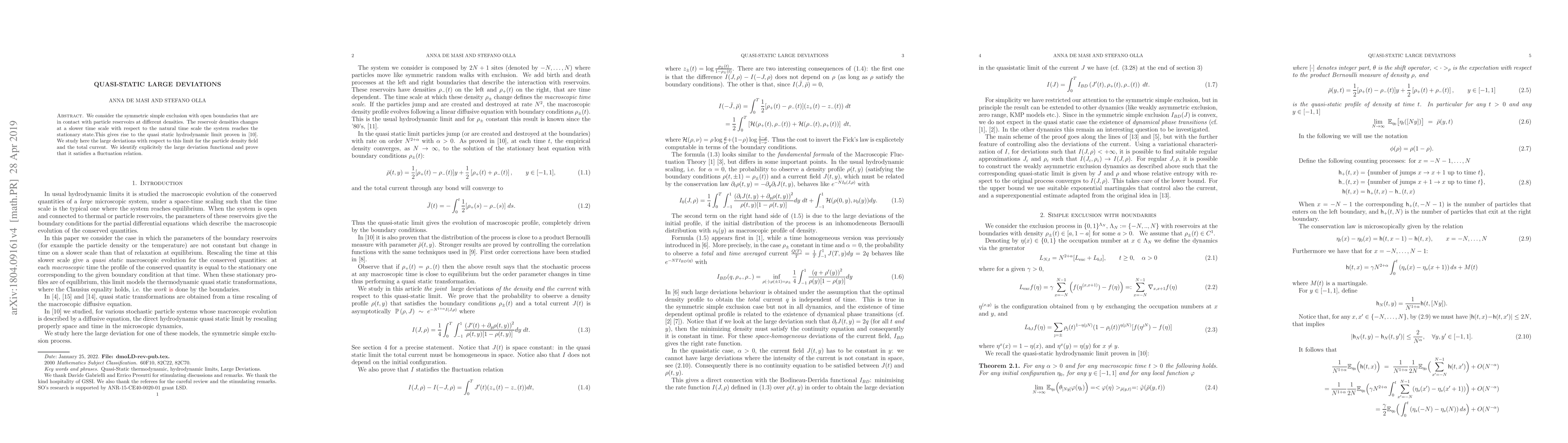 We consider the symmetric simple exclusion with open boundaries that are in contact with particle reservoirs at different densities. The reservoir densities changes at a slower time scale with respect to the natural time scale the system reaches the stationary state.This gives rise to the quasi static hydrodynamic limit proven in [10]. We study here the large deviations with respect to this limit for the particle density field and the total current. We identify explicitely the large deviation functional and prove that it satisfies a fluctuation relation.