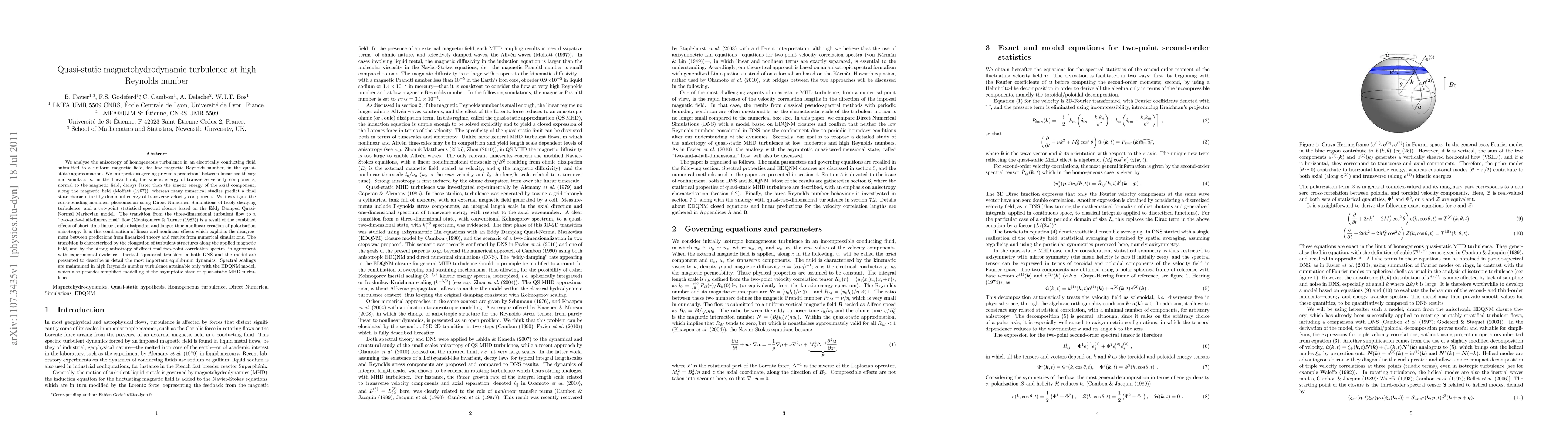 We analyse the anisotropy of homogeneous turbulence in an electrically conducting fluid submitted to a uniform magnetic field, for low magnetic Reynolds number, in the quasi- static approximation. We interpret disagreeing previous predictions between linearized theory and simulations: in the linear limit, the kinetic energy of transverse velocity components, normal to the magnetic field, decays faster than the kinetic energy of the axial component, along the magnetic field (Moffatt (1967)); whereas many numerical studies predict a final state characterised by dominant energy of transverse velocity components. We investigate the corresponding nonlinear phenomenon using Direct Numerical Simulations of freely-decaying turbulence, and a two-point statistical spectral closure based on the Eddy Damped Quasi-Normal Markovian model. The transition from the three-dimensional turbulent flow to a "two-and-a-half-dimensional" flow (Montgomery & Turner (1982)) is a result of the combined effects of short-time linear Joule dissipation and longer time nonlinear creation of polarisation anisotropy. It is this combination of linear and nonlinear effects which explains the disagreement between predictions from linearized theory and results from numerical simulations. The transition is characterized by the elongation of turbulent structures along the applied magnetic field, and by the strong anisotropy of directional two-point correlation spectra, in agreement with experimental evidence. Inertial equatorial transfers in both DNS and the model are presented to describe in detail the most important equilibrium dynamics. Spectral scalings are maintained in high Reynolds number turbulence attainable only with the EDQNM model, which also provides simplified modelling of the asymptotic state of quasi-static MHD turbulence.