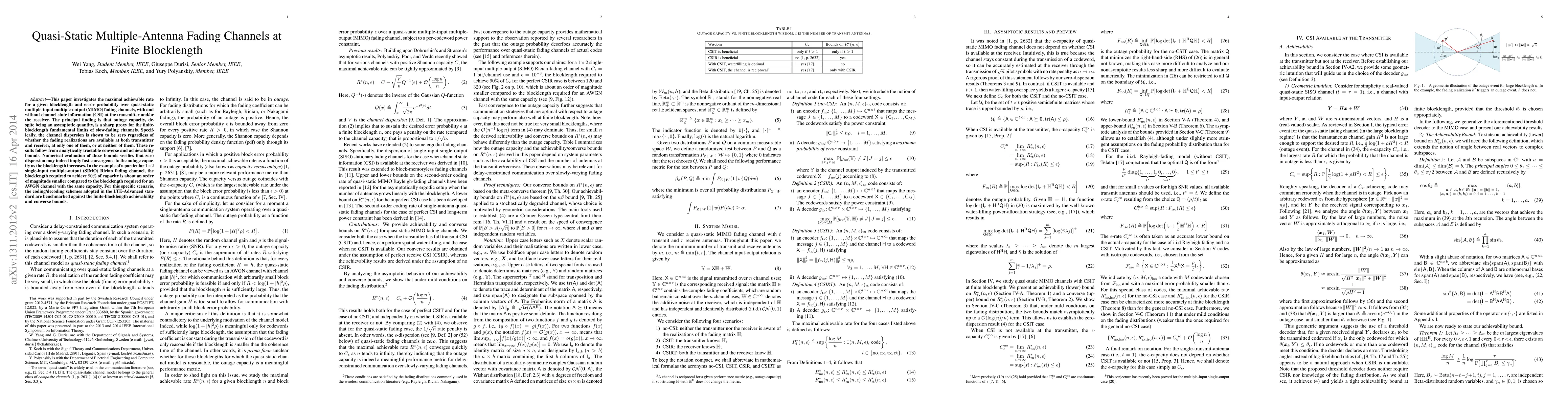 This paper explores the maximal achievable rate for finite blocklengths in quasi-static MIMO fading channels, demonstrating that outage capacity serves as a reliable proxy for finite-blocklength limits. It shows zero channel dispersion across various CSI availability scenarios, with numerical evaluations indicating rapid convergence to outage capacity.