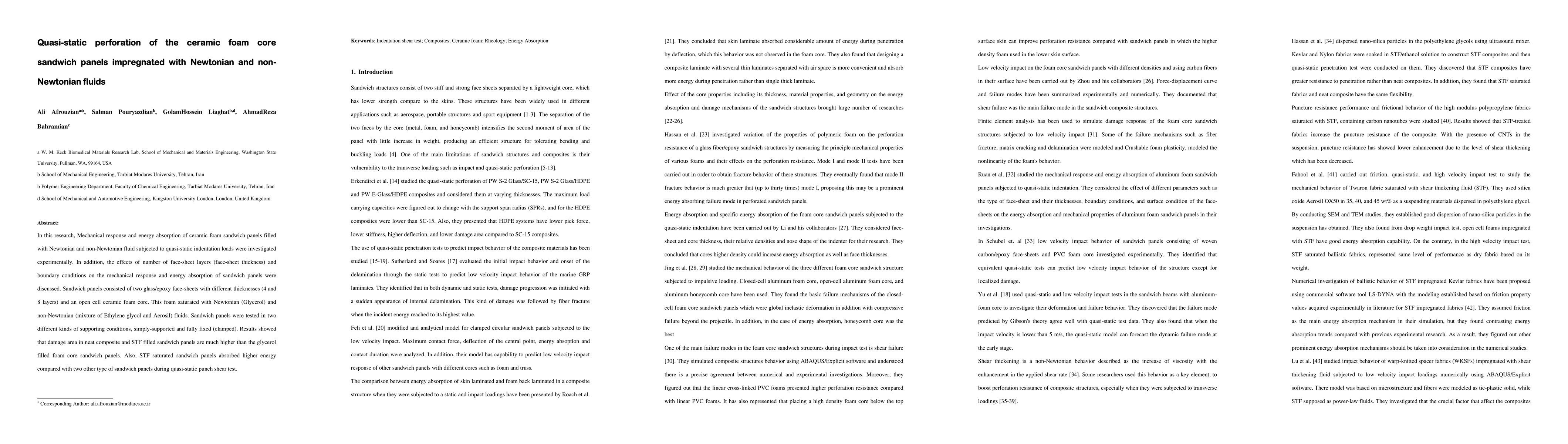 In this research, Mechanical response and energy absorption of ceramic foam sandwich panels filled with Newtonian and non-Newtonian fluid subjected to quasi-static indentation loads were investigated experimentally. In addition, the effects of number of face-sheet layers (face-sheet thickness) and boundary conditions on the mechanical response and energy absorption of sandwich panels were discussed. Sandwich panels consisted of two glass/epoxy face-sheets with different thicknesses (4 and 8 layers) and an open cell ceramic foam core. This foam saturated with Newtonian (Glycerol) and non-Newtonian (mixture of Ethylene glycol and Aerosil) fluids. Sandwich panels were tested in two different kinds of supporting conditions, simply-supported and fully fixed (clamped). Results showed that damage area in neat composite and STF filled sandwich panels are much higher than the glycerol filled foam core sandwich panels. Also, STF saturated sandwich panels absorbed higher energy compared with two other type of sandwich panels during quasi-static punch shear test.