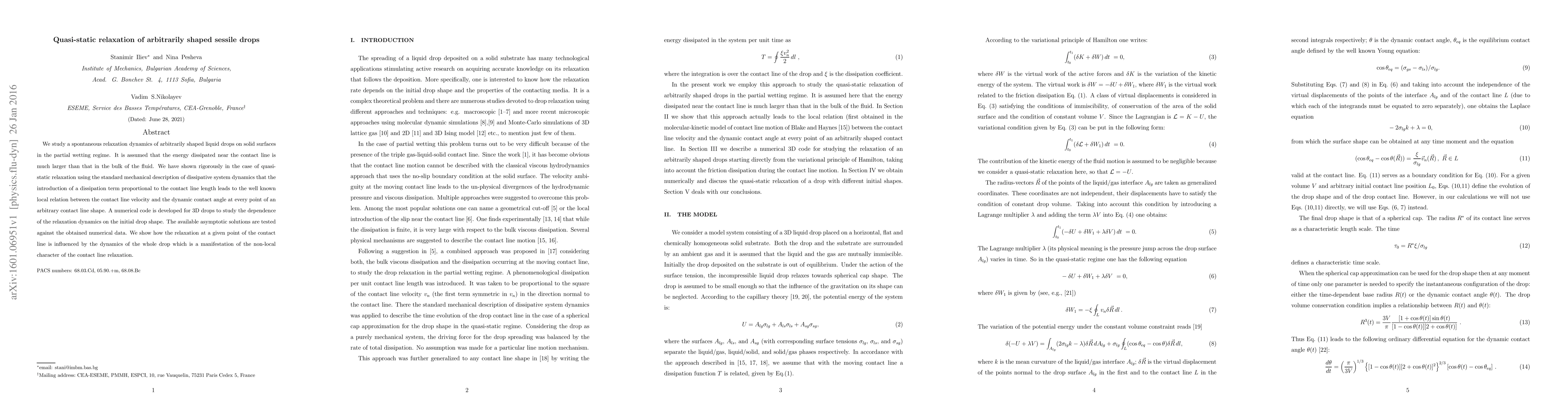 This paper investigates the quasi-static relaxation dynamics of arbitrarily shaped liquid drops on solid surfaces, focusing on the partial wetting regime. It introduces a dissipation term proportional to the contact line length, leading to a local relation between contact line velocity and dynamic contact angle, and develops a numerical code to study the relaxation dynamics influenced by the entire drop's shape.