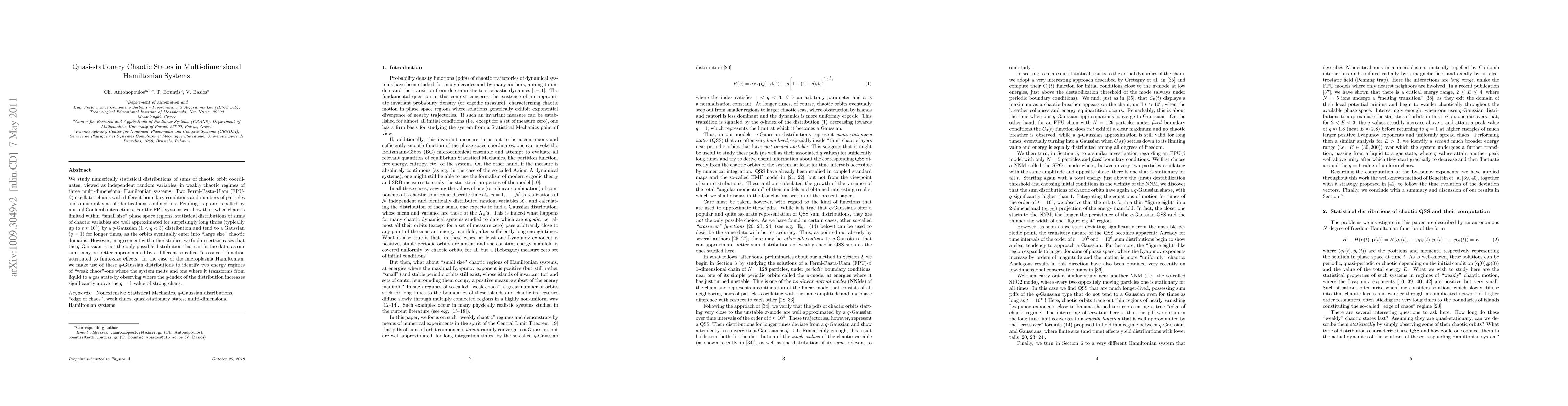 This paper numerically investigates the statistical distributions of chaotic orbit coordinates in weakly chaotic regimes of three multi-dimensional Hamiltonian systems, showing that sums of these coordinates follow $q$-Gaussian distributions for extended periods before transitioning to Gaussian distributions. The study also identifies two energy regimes in a microplasma system based on the $q$-index of these distributions.