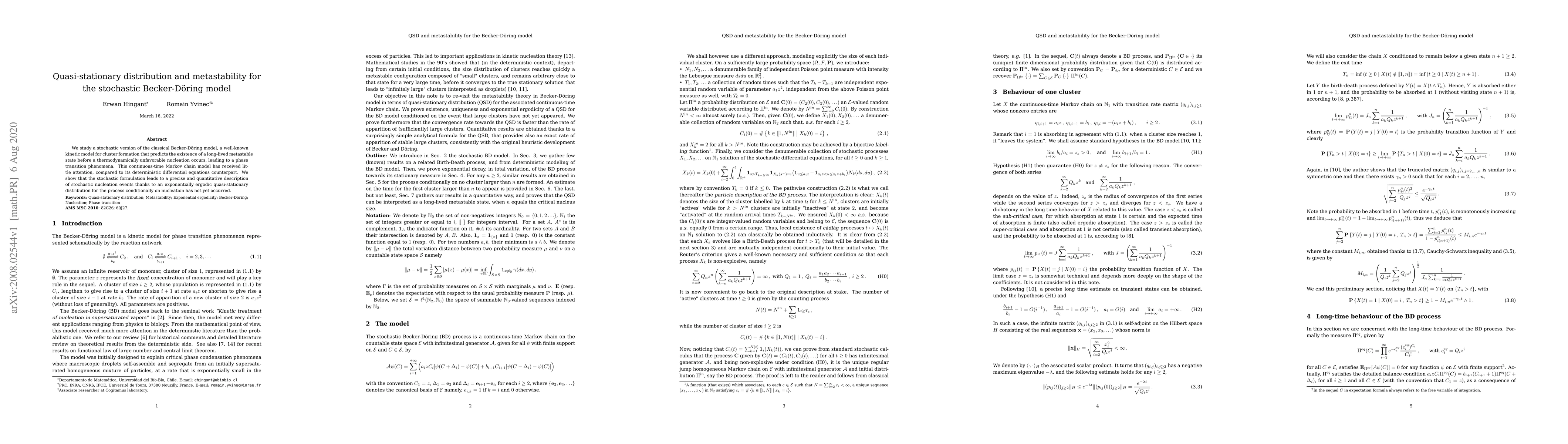 This paper investigates the stochastic version of the Becker-Döring model, focusing on its metastability and quasi-stationary distribution. It demonstrates that the stochastic model provides a detailed description of nucleation events, facilitated by an exponentially ergodic quasi-stationary distribution.