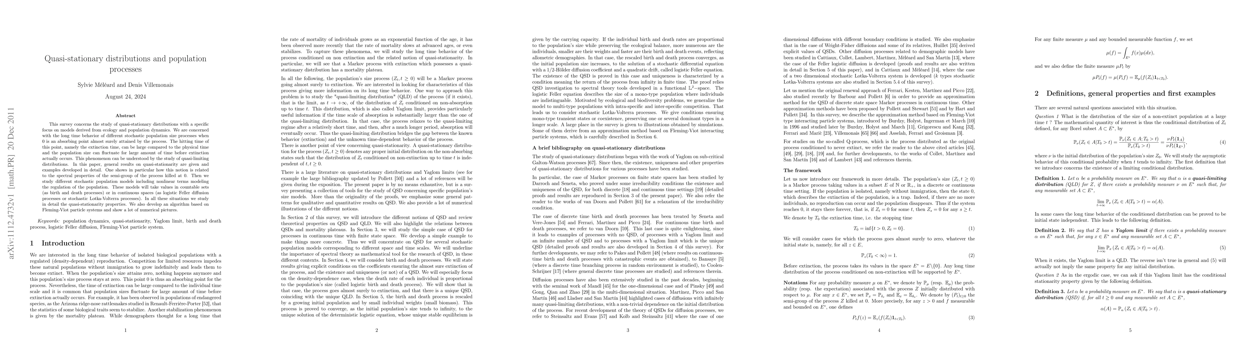 This paper surveys quasi-stationary distributions in ecological and population dynamics models, focusing on the long-term behavior of stochastic population processes near extinction. It explores quasi-stationary distributions and their relation to spectral properties, analyzing various stochastic population models and developing an algorithm based on Fleming-Viot particle systems.